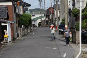 海岸線の班は津波避難訓練を並行して行います。メガホンで避難を呼びかける人について避難します。