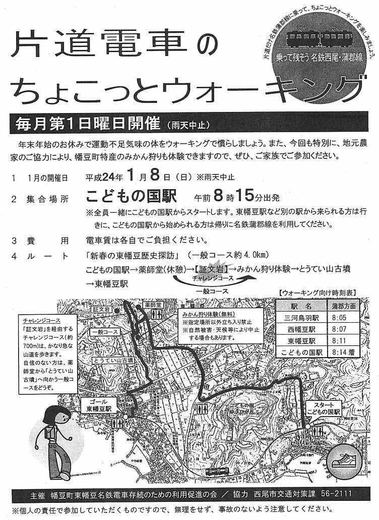 H24.1.8(日)の様子です 今回はこどもの国駅出発で、「新春の東幡豆歴史探訪」と名をうって、寒かったですが風もなく快晴の青空の下でウォーキングと名鉄電車を楽しんで、東幡豆駅で解散しました。 参加者はちょうど30名でした。