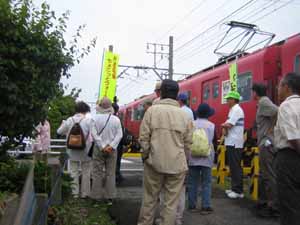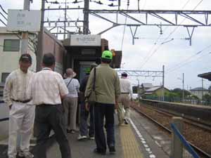 三河鳥羽駅を下りて踏切のところで、会長の挨拶とコース案内があって出発です |