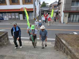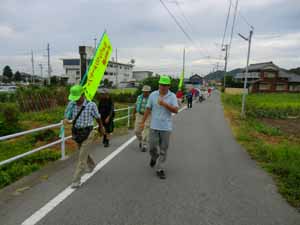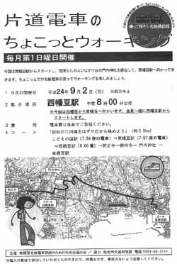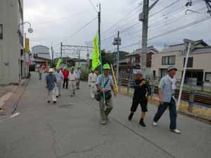 ![]() 「片道電車のちょこっとウォーキング」の 旗を持って、出発です |