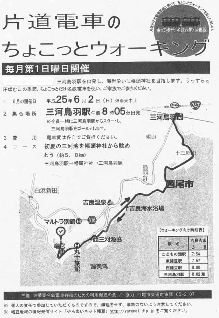 H25.6.2(日)の様子です。今回は、昨年の6月と同じですが、三河鳥羽駅出発で吉良町宮崎の幡頭神社までの往復ウォーキングです。