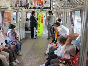 電車の中でも幟を立てて「ちょこっとウォーキング」のPRです。30人が乗っています |