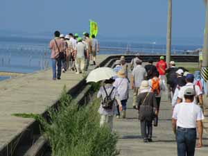 海岸に出て堤防を歩きます。今年の日差しは特に強い。しかし海からの風が涼しさを誘います |