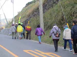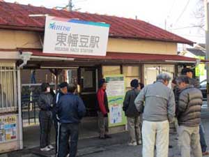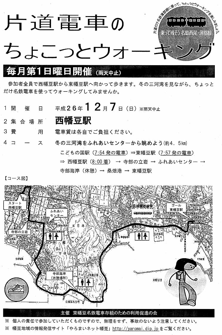 H26.12.7(日)の様子です。 この冬は寒くなるのが早く、冷え込んだ日曜日の朝、東幡豆駅で乗車、こどもの国駅から乗車の人と合流し出発しました。目的のふれあいセンターからの三河湾は素敵で、渥美半島はもちろん、三重県の神島、菅島、志摩半島までくっきり見えました。冬の澄んだ空気の透明度は抜群です。また、休憩場所では主催者代表で東幡豆区長でもある市川さんから、今日午後形原小学校で開催の「名鉄西尾蒲郡線利用促進大会」のPRの話を聞き、みんな参加しようと決めました