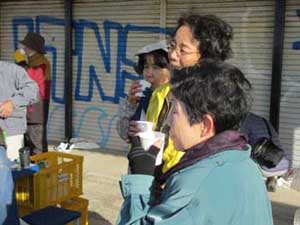 熱いお茶やスポーツドリンクを飲みながら休憩、歓談します。世話役の本郷組の役員さん、ご苦労様です