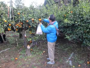 みかん農園に着いて、用意してもらえたハサミでみかんを沢山採りました。木を傷めない代に気を付けます