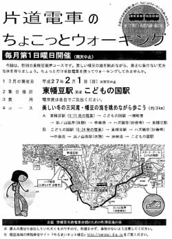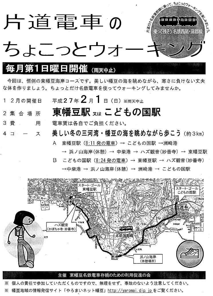 H27.2.1(日)の様子です。昨年の2月は、冬の雨で中止でした。 今回は東幡豆駅とこどもの国駅の両方の出発です。「美しい冬の三河湾/幡豆の海を眺めながら歩こう」のコースでした。寒くて海岸通りは風も強く大変でした。しかし、真っ青な空と真っ青の三河湾を見ながら、いい汗をかきました。