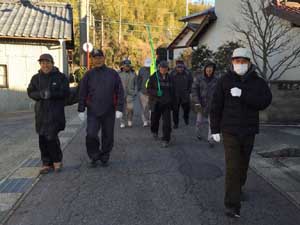 それぞれの班が交差合流し、浜ノ山海岸で休憩です。森組町内会の役員さん、ご苦労様です。また、区長の挨拶があって、また反対方向に出発し、東幡豆駅、こどもの国駅に到着して解散です |