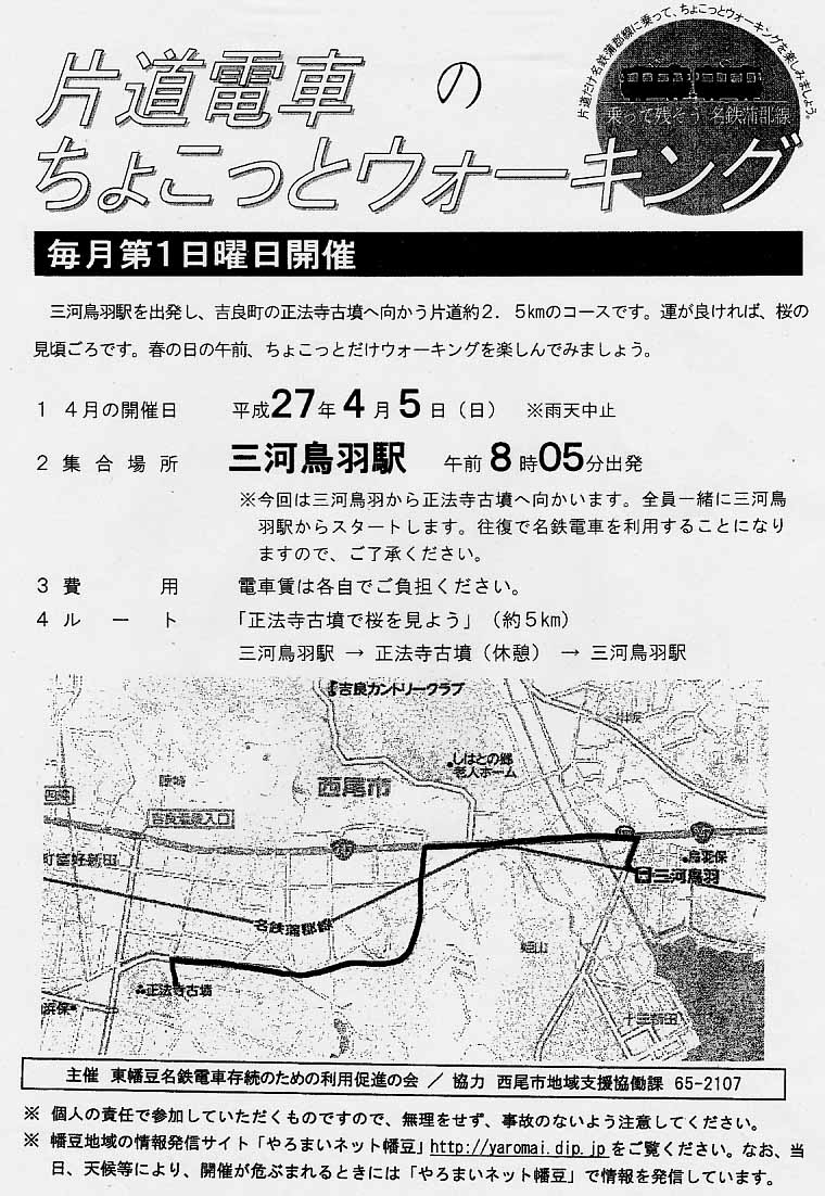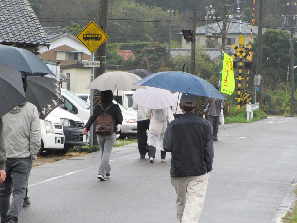 H27.4.5(日)の様子です。 この春は雨が多く、3月の例会が雨天中止になってしまいました。5日早朝、雨が止んでいて天気予報は回復するとのことで、開催を決定しましたが、駅に集まる頃にはまた降り出してしまいました小雨の中、傘が手放せない「ちょこっとウォーキング」でした。