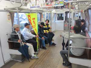 車内でこどもの国駅から乗車した人と合流し、早速、話に花が咲きます。三河鳥羽駅までの2区間の乗車です |