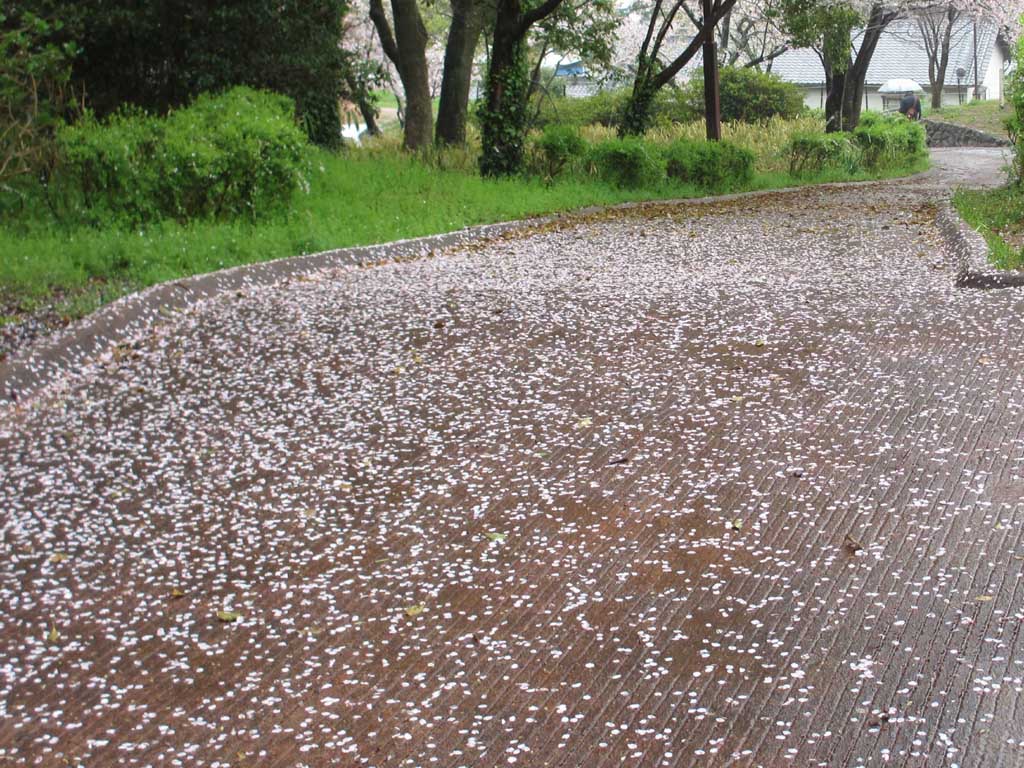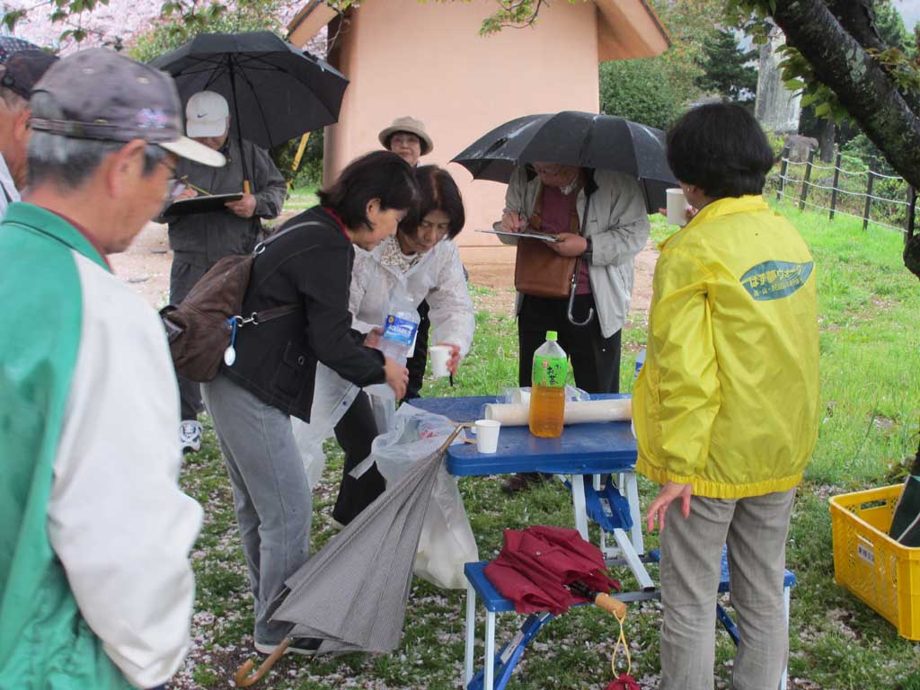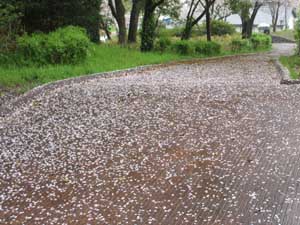 東屋での休憩後、新年度会長の紹介があり、昨年度までの会長の挨拶があって、帰路につきました。雨に濡れた桜絨毯の上を歩き、はらはら散る桜を見ながら鳥羽駅まで向かいました
