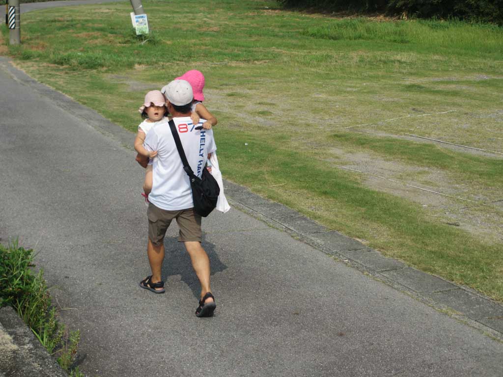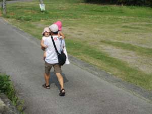 あれー!このおじいちゃん、孫2人を抱いてのウォーキングです。始めは歩いていたけど、疲れてだっこです。体力が凄い!