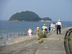 海岸堤防がカーブして、正面に前島が見えてきました。平成9年までは、うさぎを放し飼いにしていて、観光客で賑わいました。最近では、春の潮干狩りシーズンに大変賑わっています