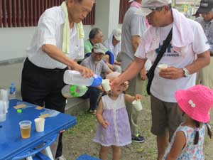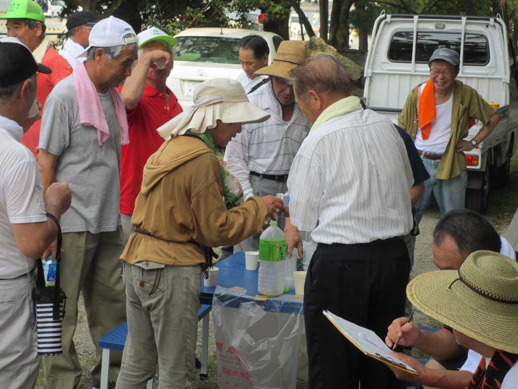 休憩所である小見行組公民館に着きました。汗をかいたあと、冷えたお茶、スポーツドリンクの美味しいこと。当番の洲崎組役員さんご苦労様!