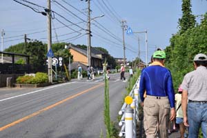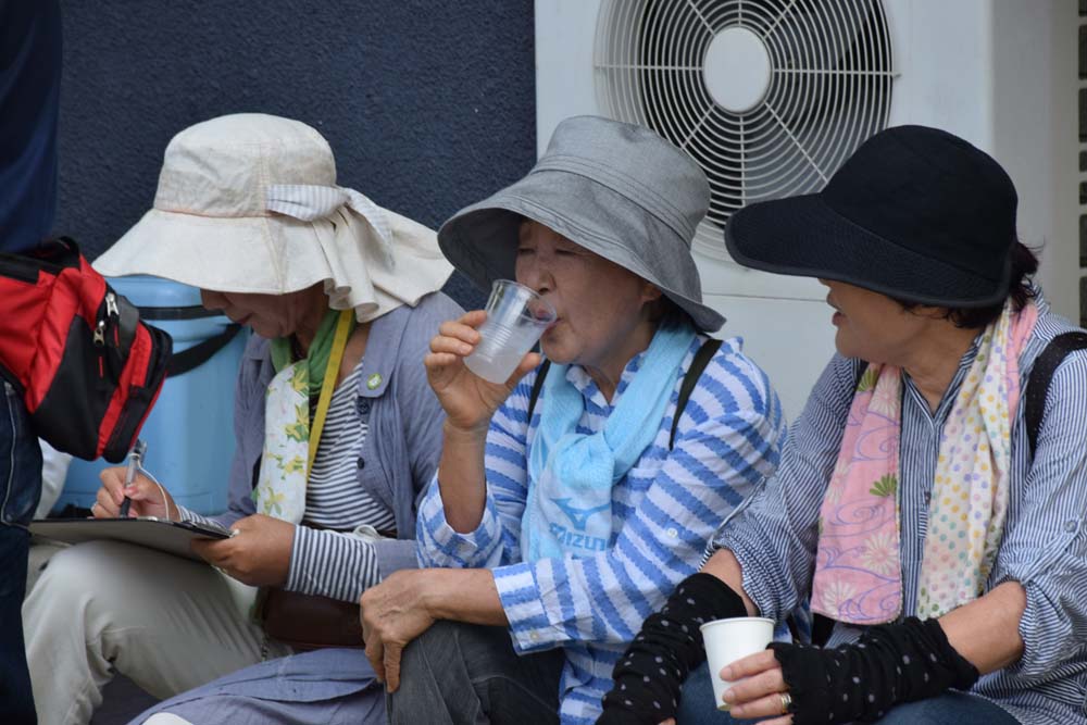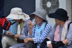 梅雨が明けてから、猛暑が続いています。7日も朝から、熱い日射しが照りつけています。休憩所では、ドリンクサービスが有るとは言え、みんな熱中症対策でペットボトルを持参で参加です。