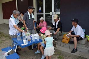 休憩場所の小見行公民館に着きました。今日は冷たいスポーツドリンクや冷えたお茶が大人気です。