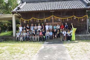 好例の集合写真です。撮影者は例によって会長です。津島社の拝殿前での撮影です