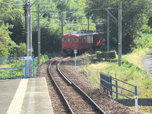 駅を出て行く電車、西浦に向かいます