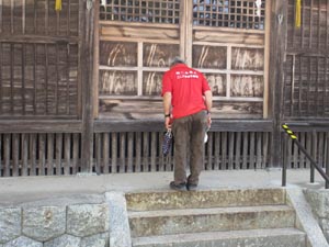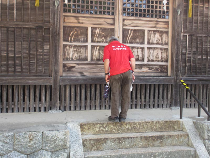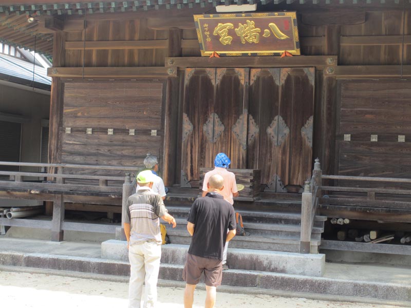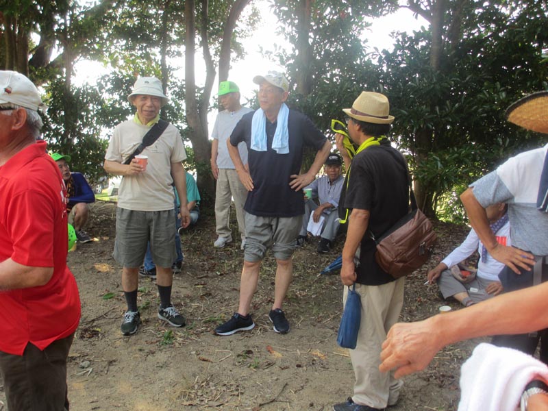 この猛暑と町内会行事もあって少し少ない25人が参加しました。休憩の後は氏神さんを参拝ししました。
