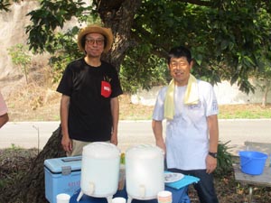 記録的に梅雨明けが早く、猛暑酷暑です。5日も朝から、熱い日射しが照りつけています。休憩所では、ドリンクサービスが有るとは言え、みんな熱中症対策で