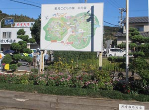 こどもの国駅で下車です。駅には大きな「愛知こどもの国」の案内看板が花壇に立っています。この花壇は洲崎町内会が世話をしていて、いつもきれいな花が咲いています。ありがとうございます
