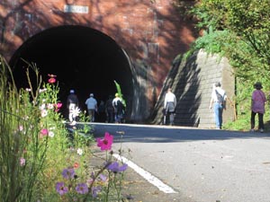 コスモスを背にし「見晴らしトンネル」に入ります。汗がピークになります。秋の風が通り抜けます
