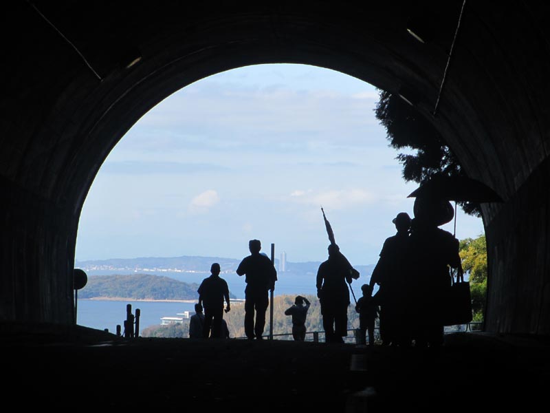 峠の「見晴らしトンネル」出口から撮りました。ウォーキングのシルエット、三河湾と寺部岬・梶島、遠くには知多半島の観光ホテルまでよく見えます。さすが「見晴らしトンネル」です