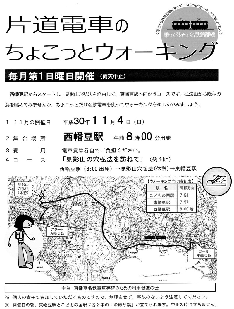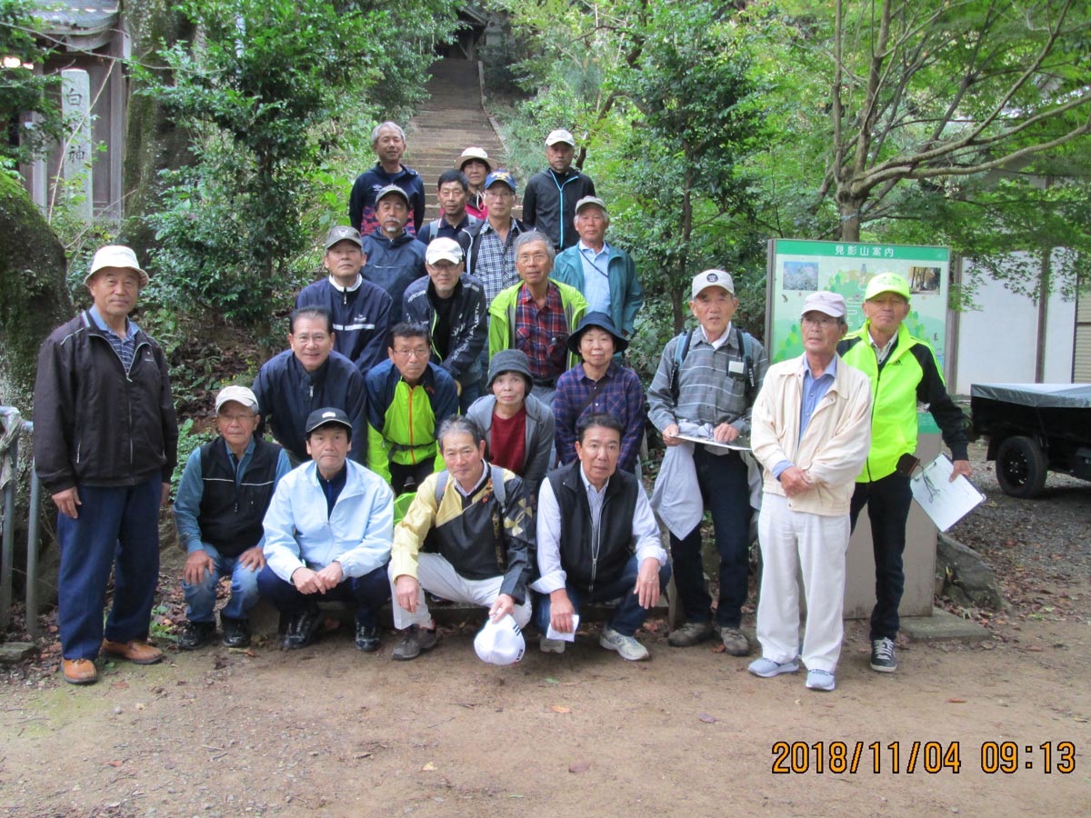 | H30.11.4(日)の様子です。昨年は上天気でした。今年の天気は、「あまり良くない」との予報で、会長は迷ったけど開催!東幡豆駅での解散まで何とか傘は差さずに済みました。 ふもとの平和の塔から、今日は足下が悪く、気をつけながら山頂までと下りも続く穴弘法をお参りし、麓まで下りました。集合写真を撮り、それから東幡豆駅まで歩き解散しました。天気が心配でしたが、25人がいい汗をかきました。 *見影山の穴弘法については、西尾市観光協会へ (外部リンク) |