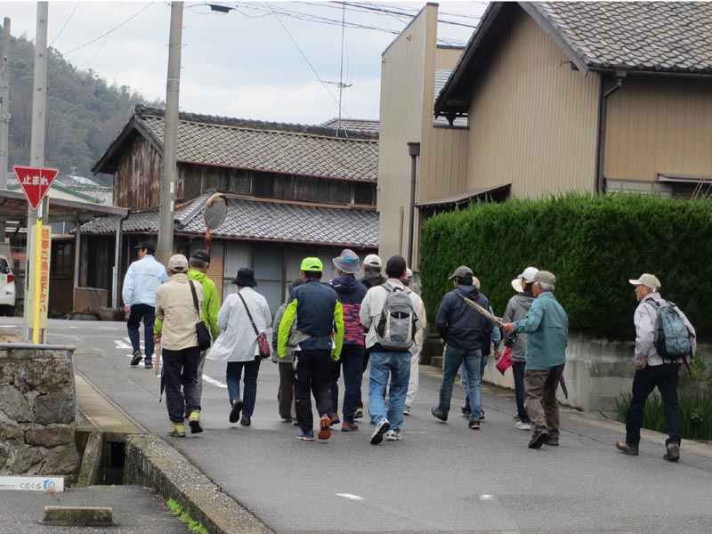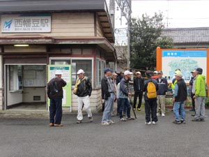 ![]() 西幡豆駅で会長の挨拶と「雨上がりで滑りやすく注意!」と話があって出発です天気が、いまいちで傘持参組も・・・ |