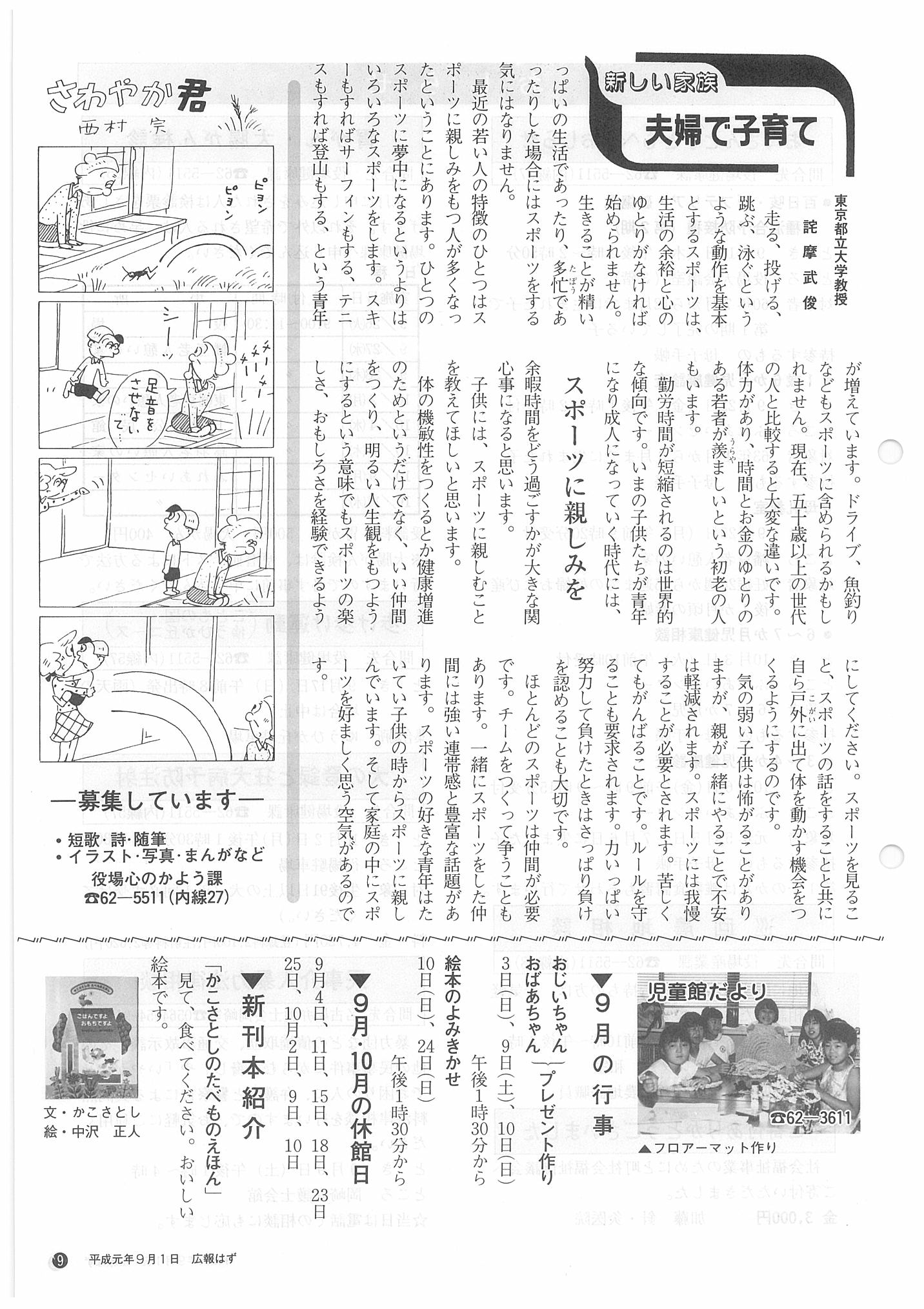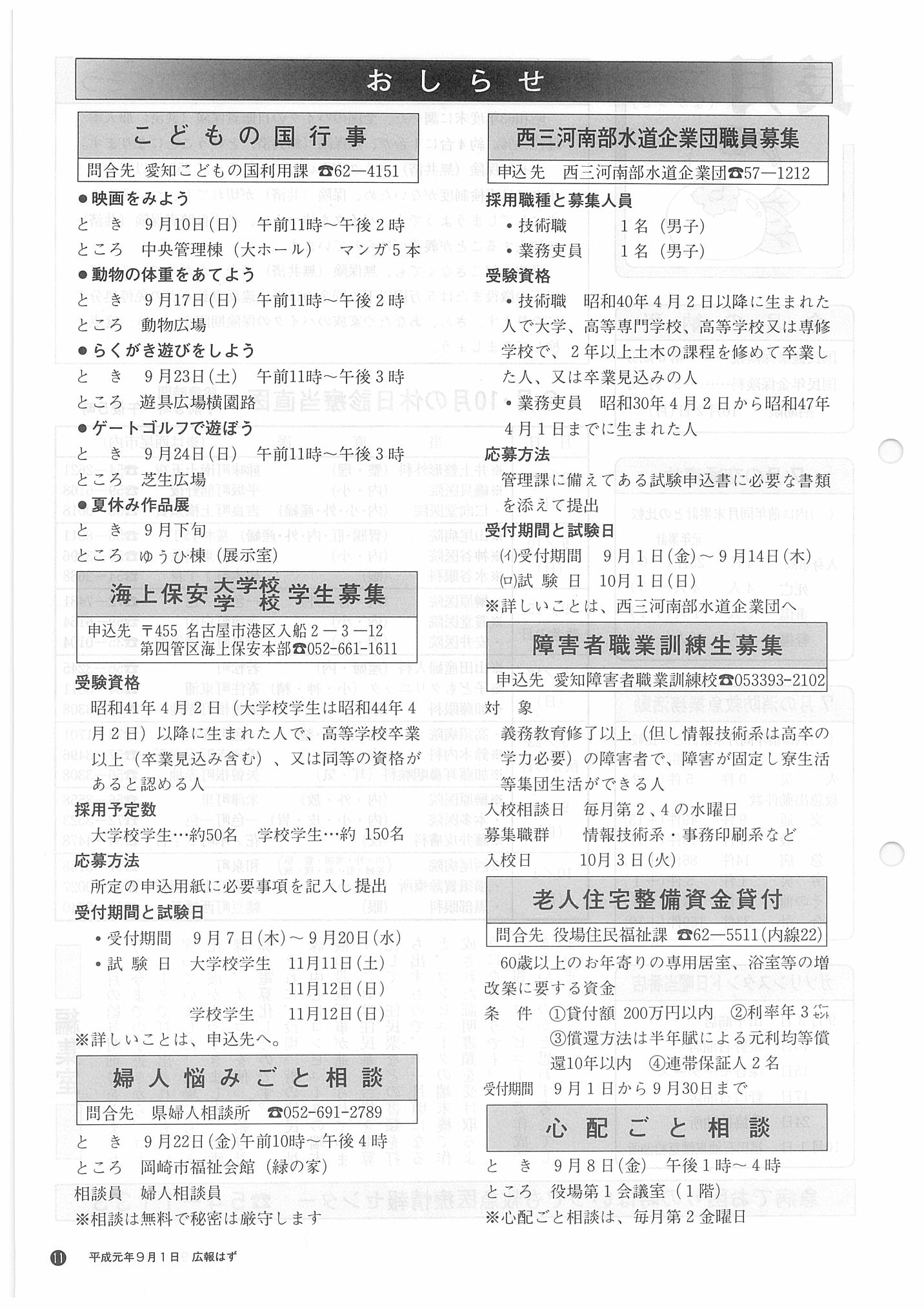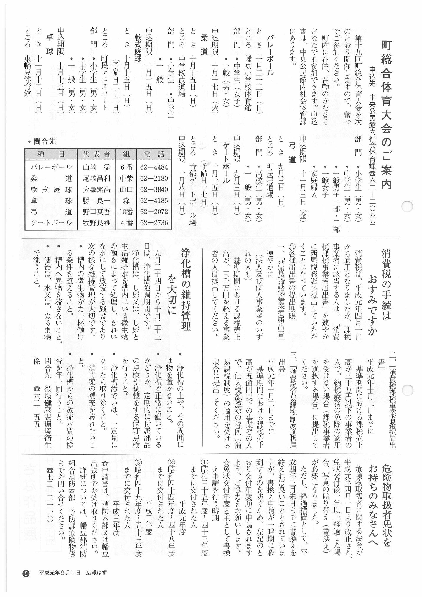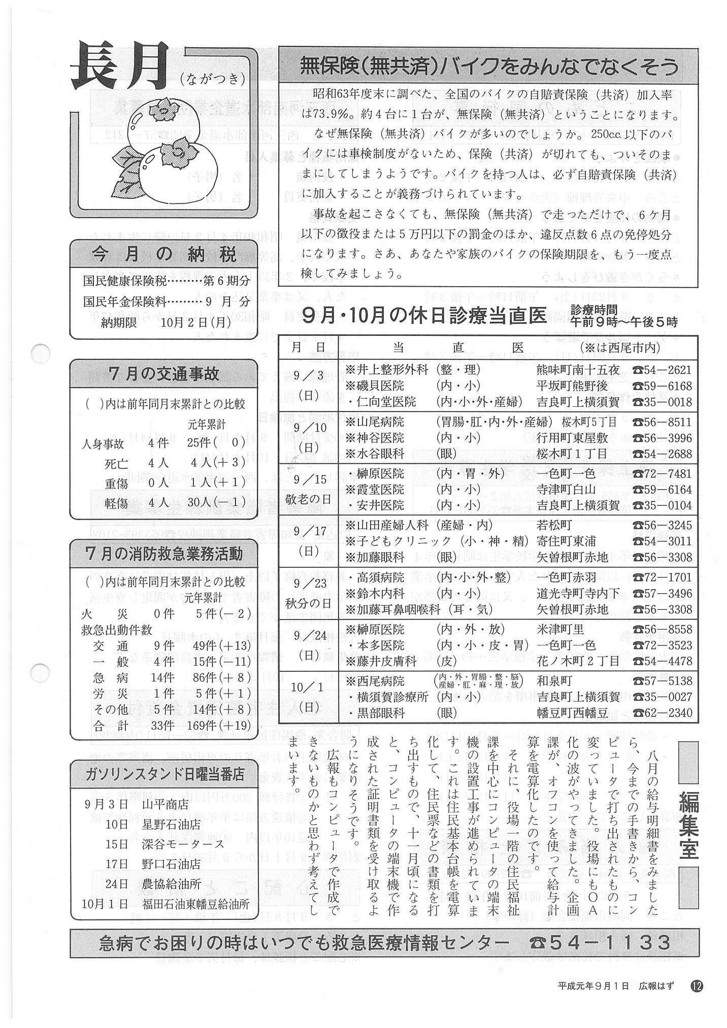 「広報はず」 1989年(平成元年) 9月号 目次