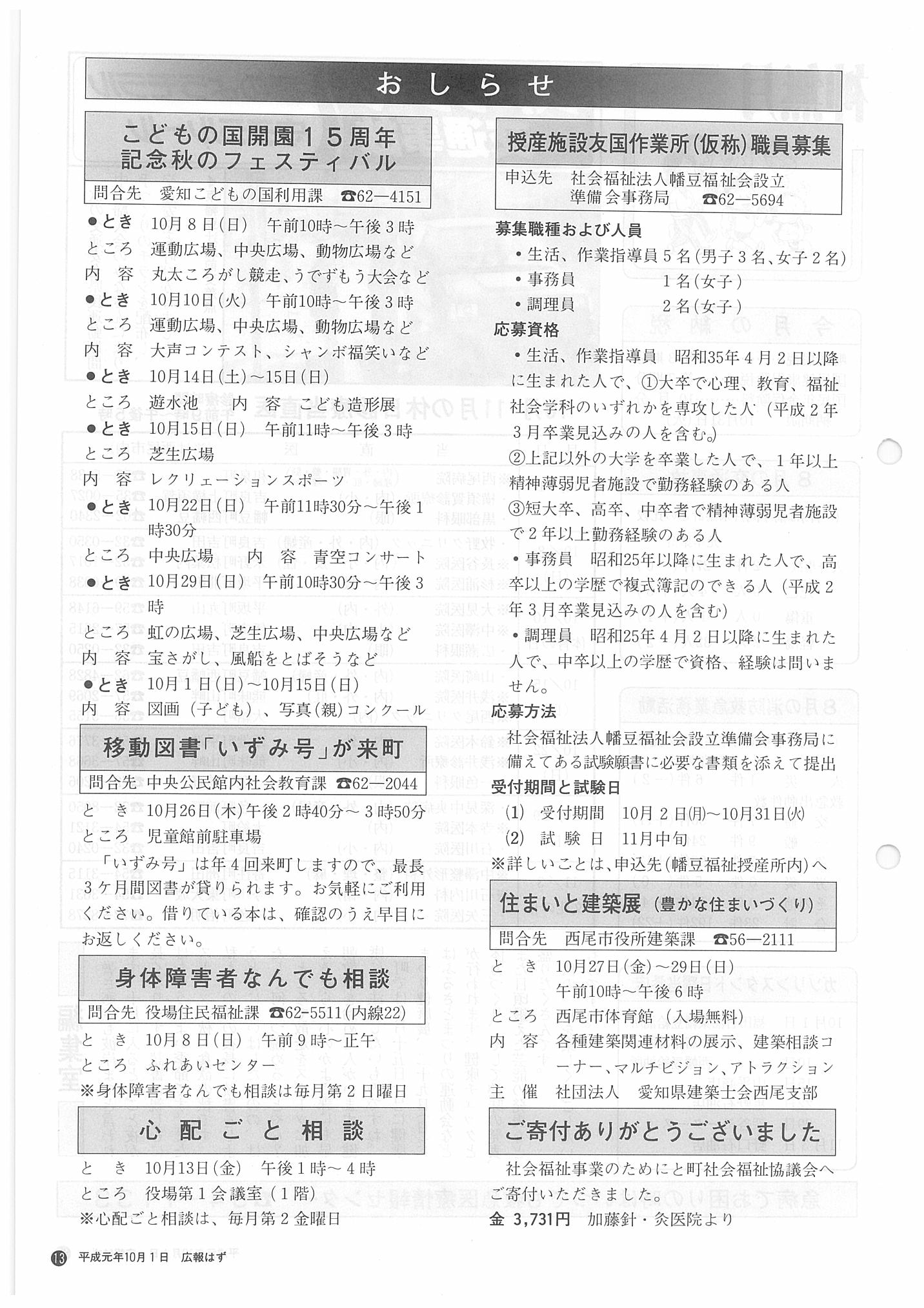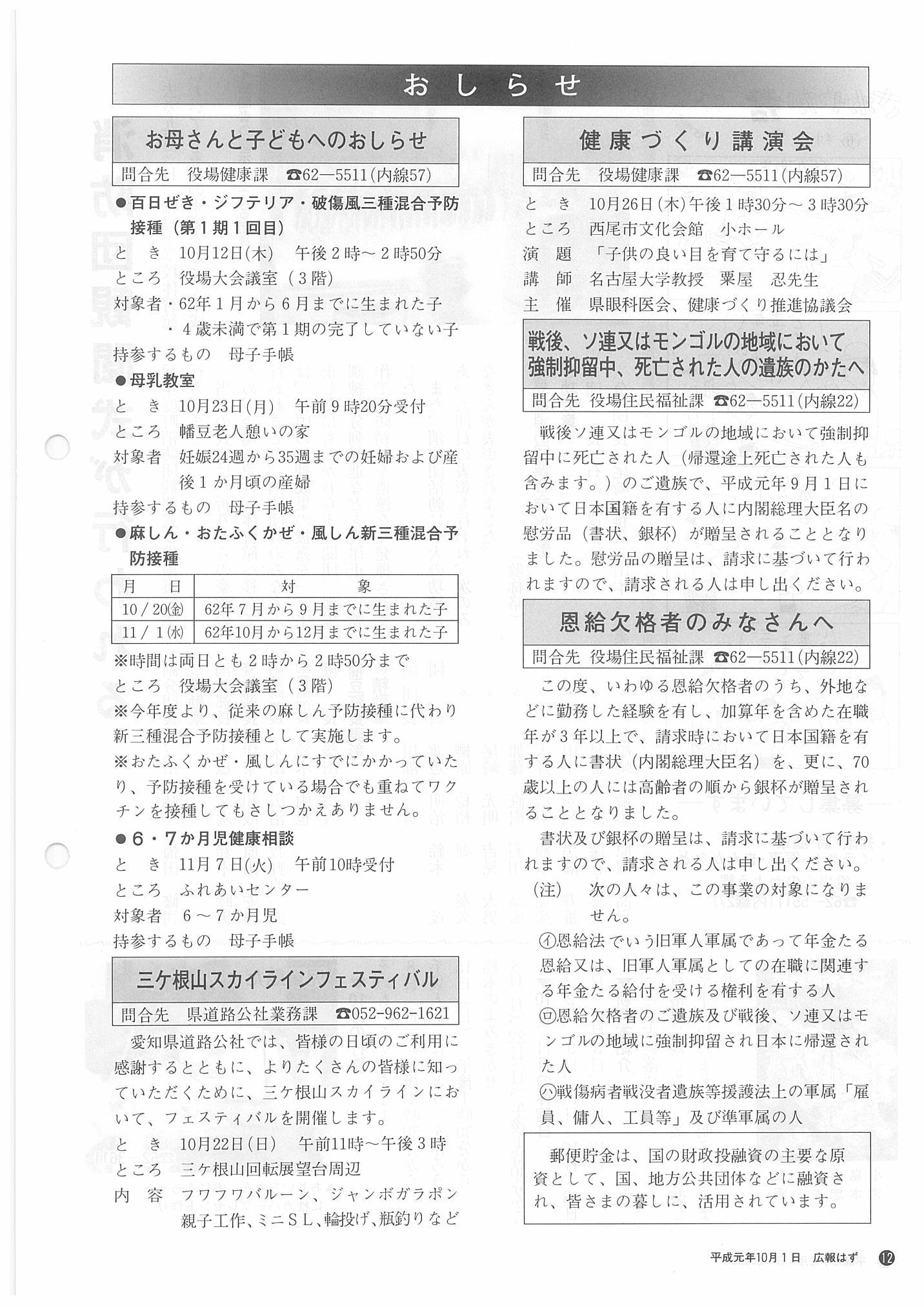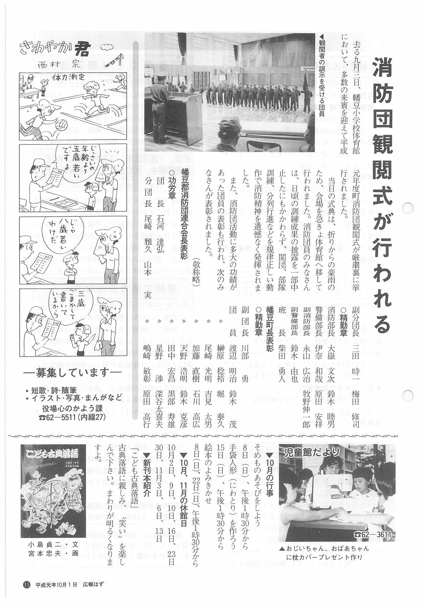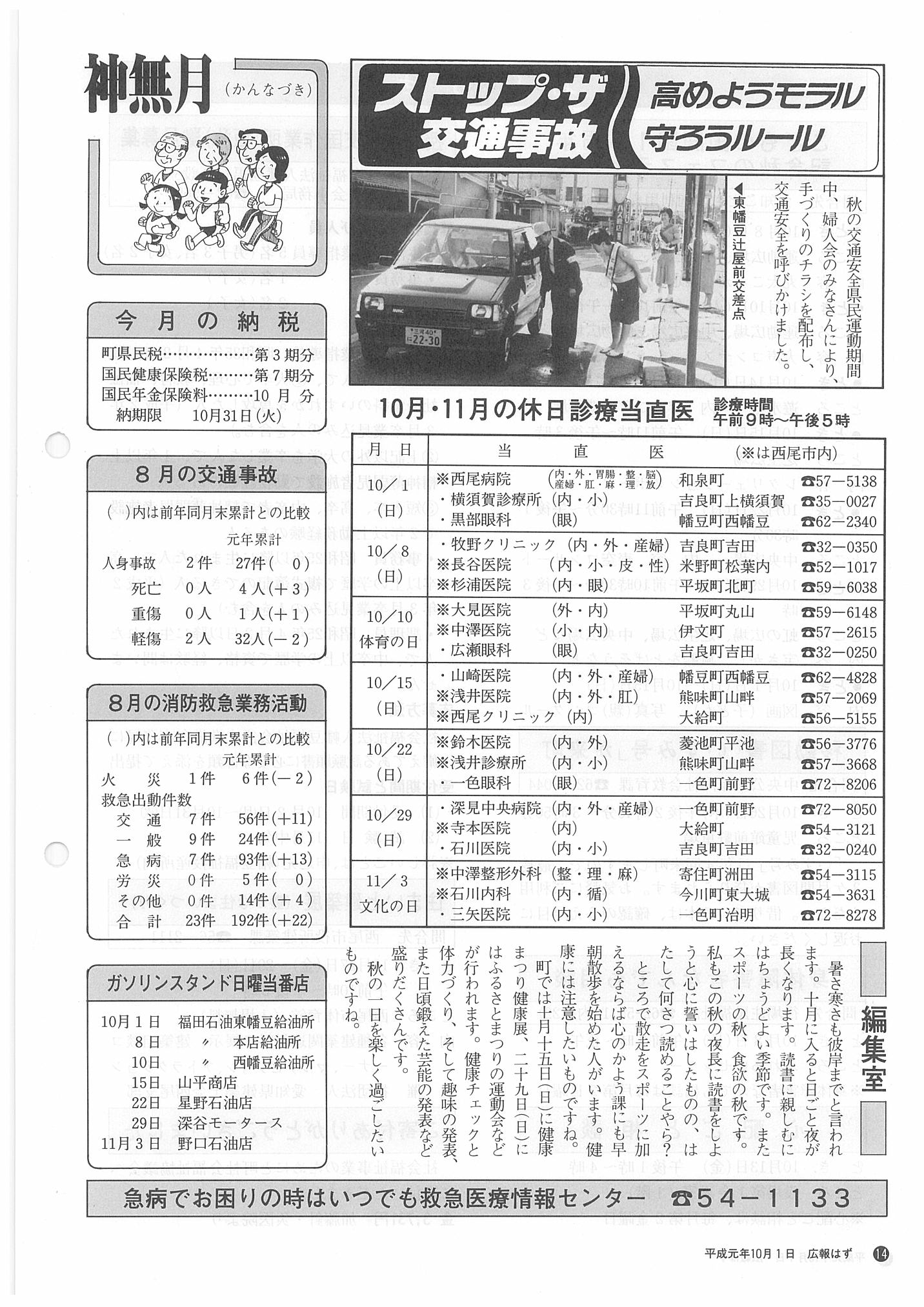 「広報はず」 1989年(平成元年) 10月号 目次