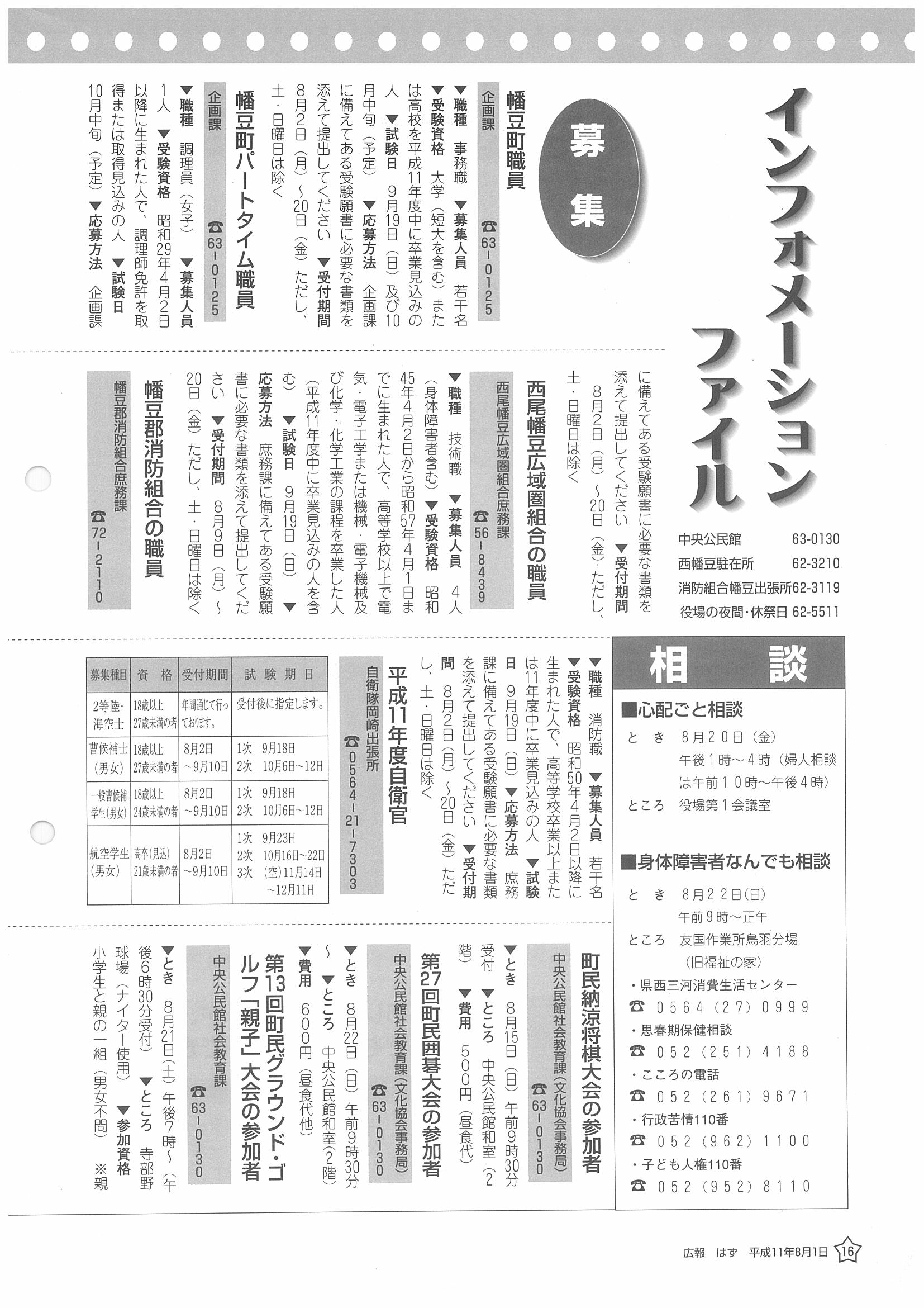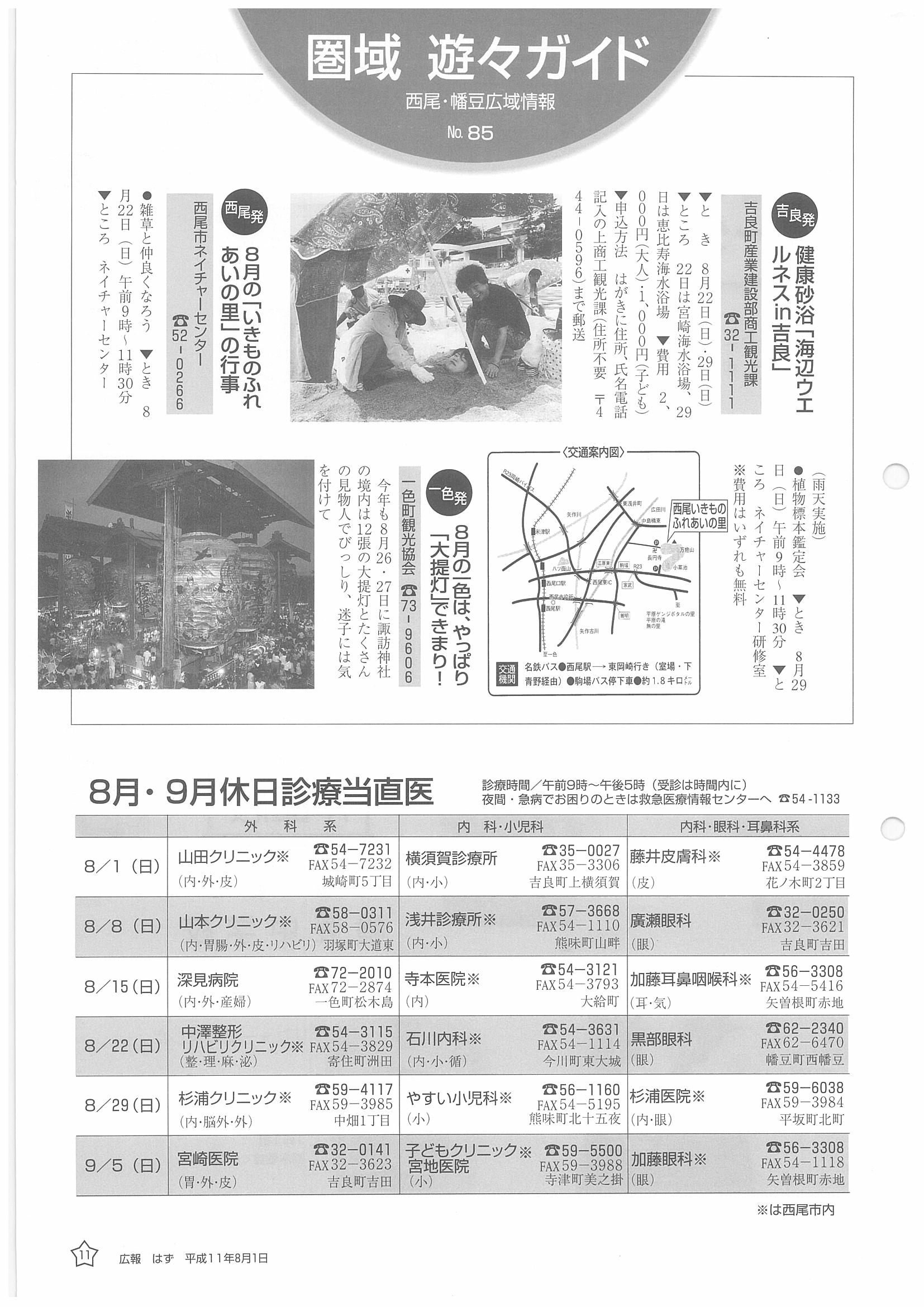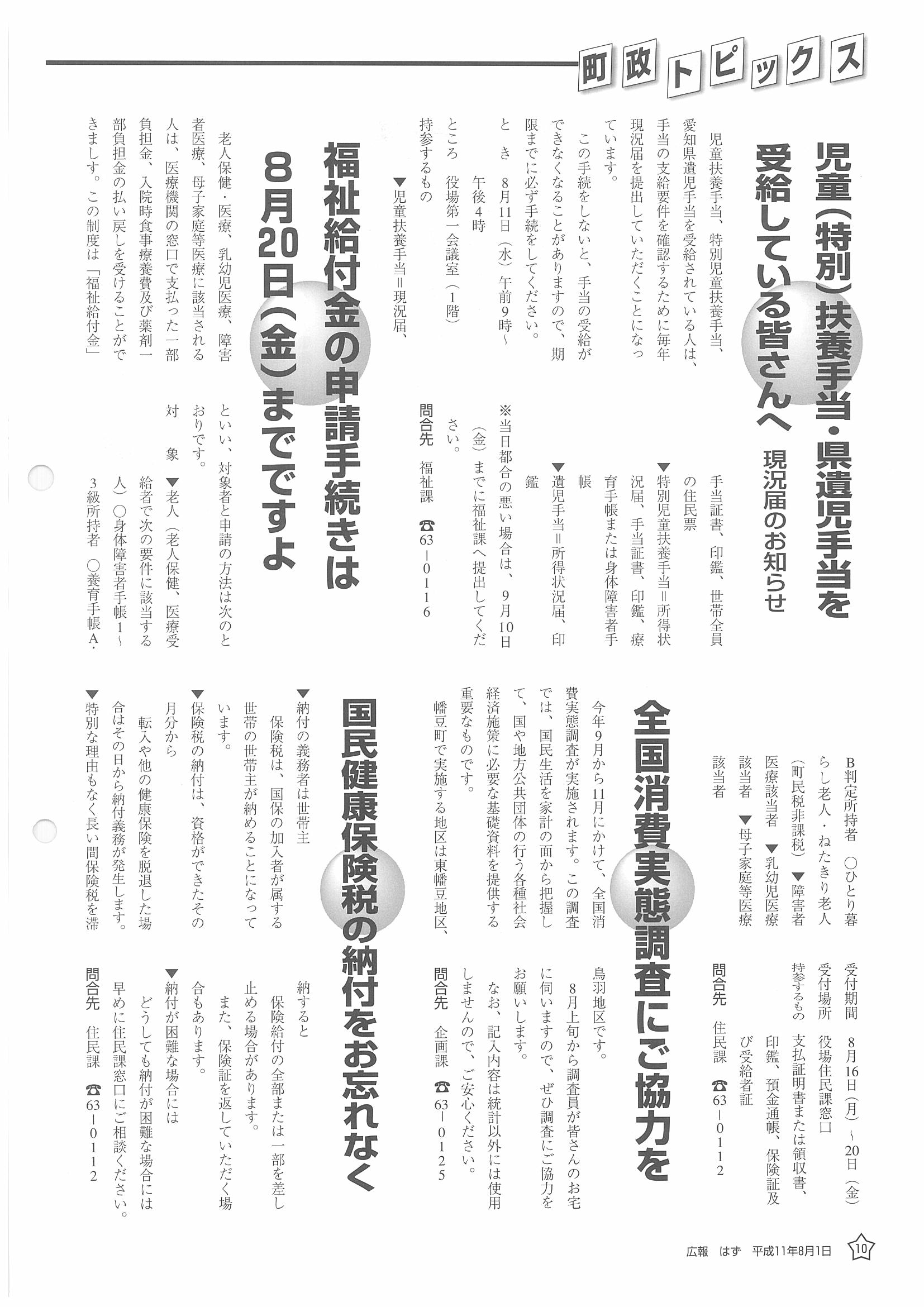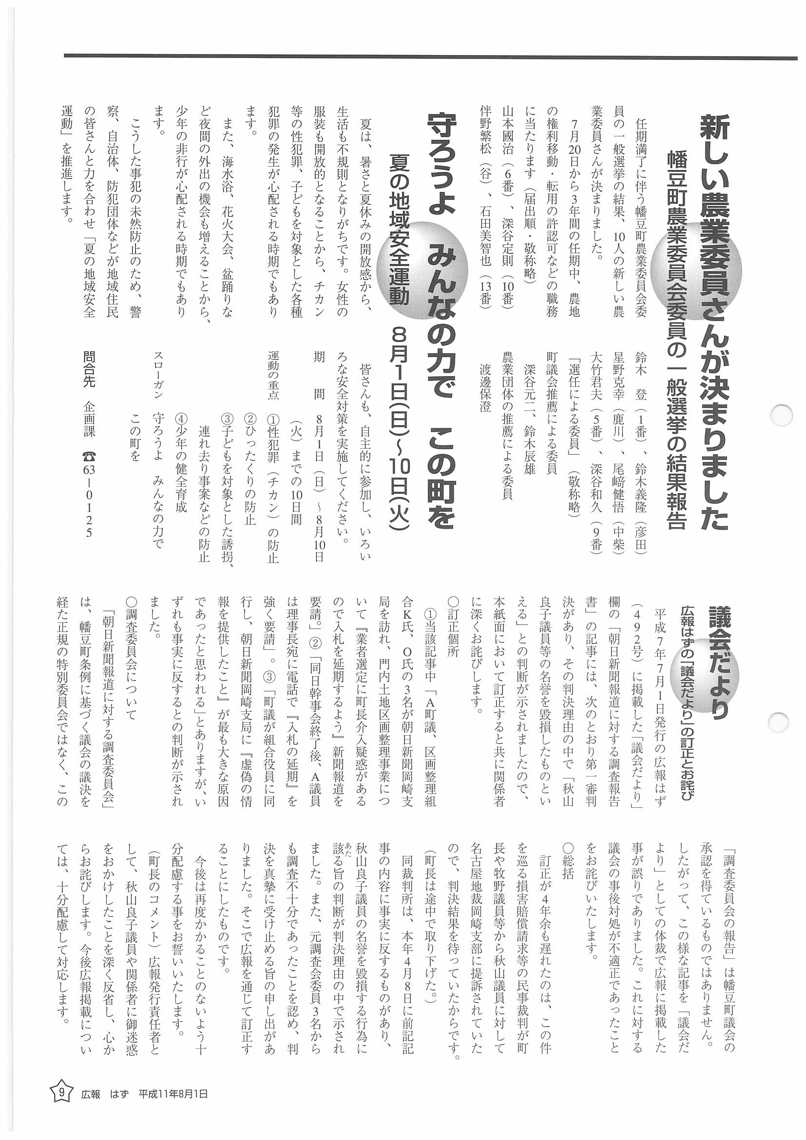 「広報はず」 1999年(平成11年) 8月号 目次