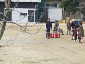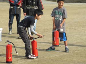 消火器の取り扱い訓練。小学校子供会も