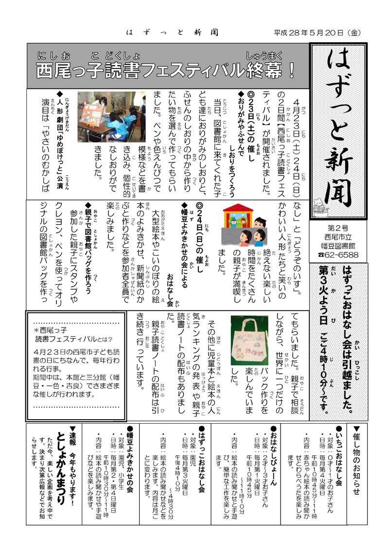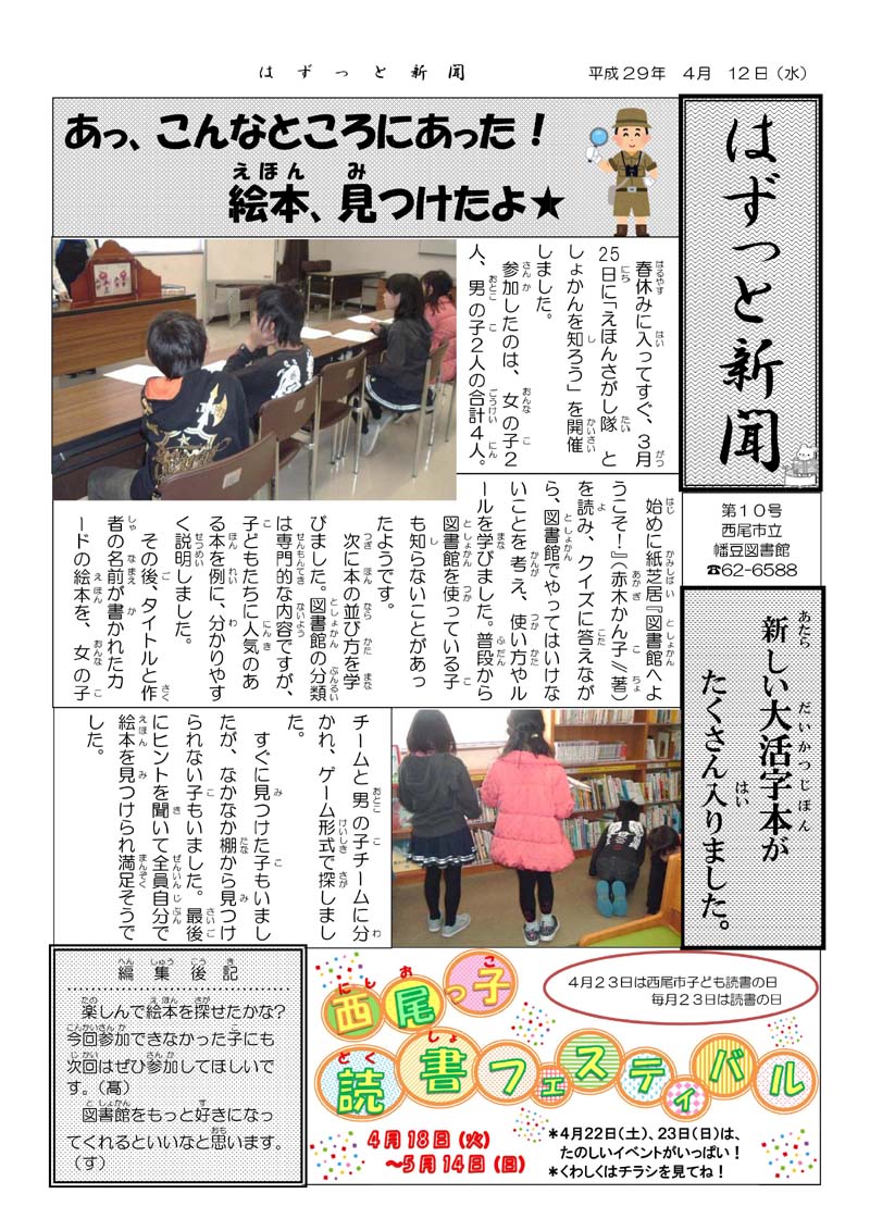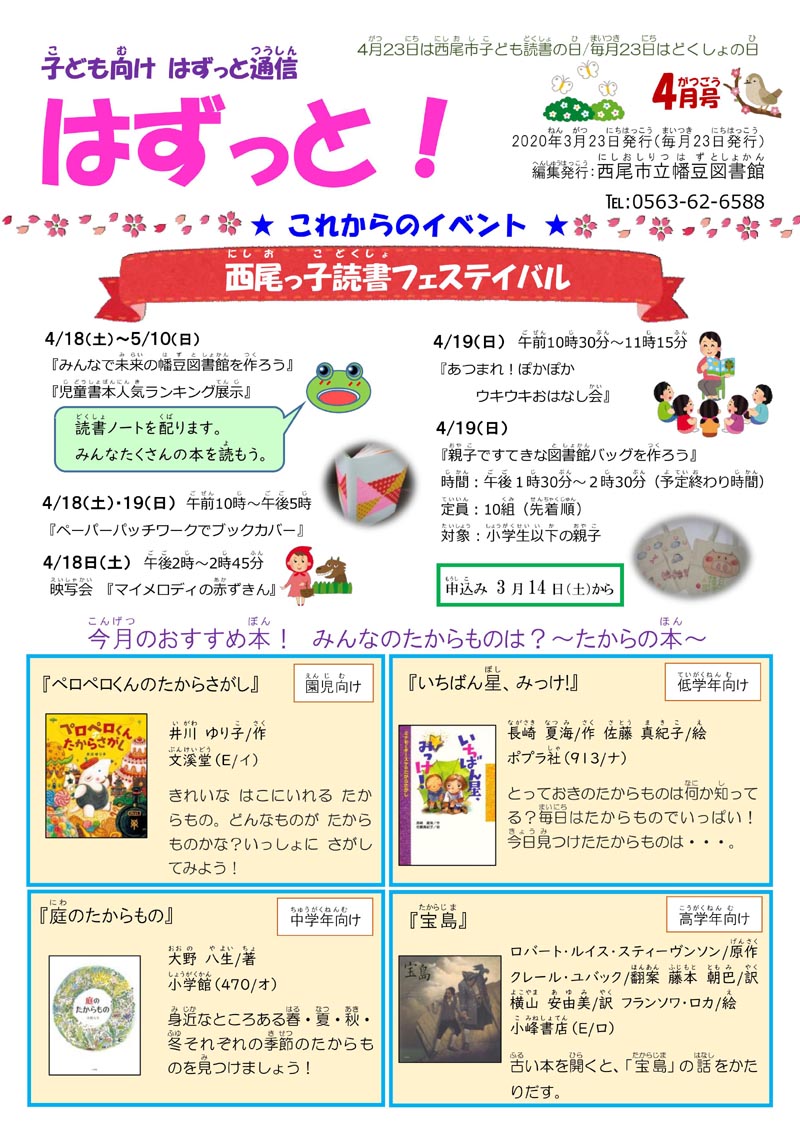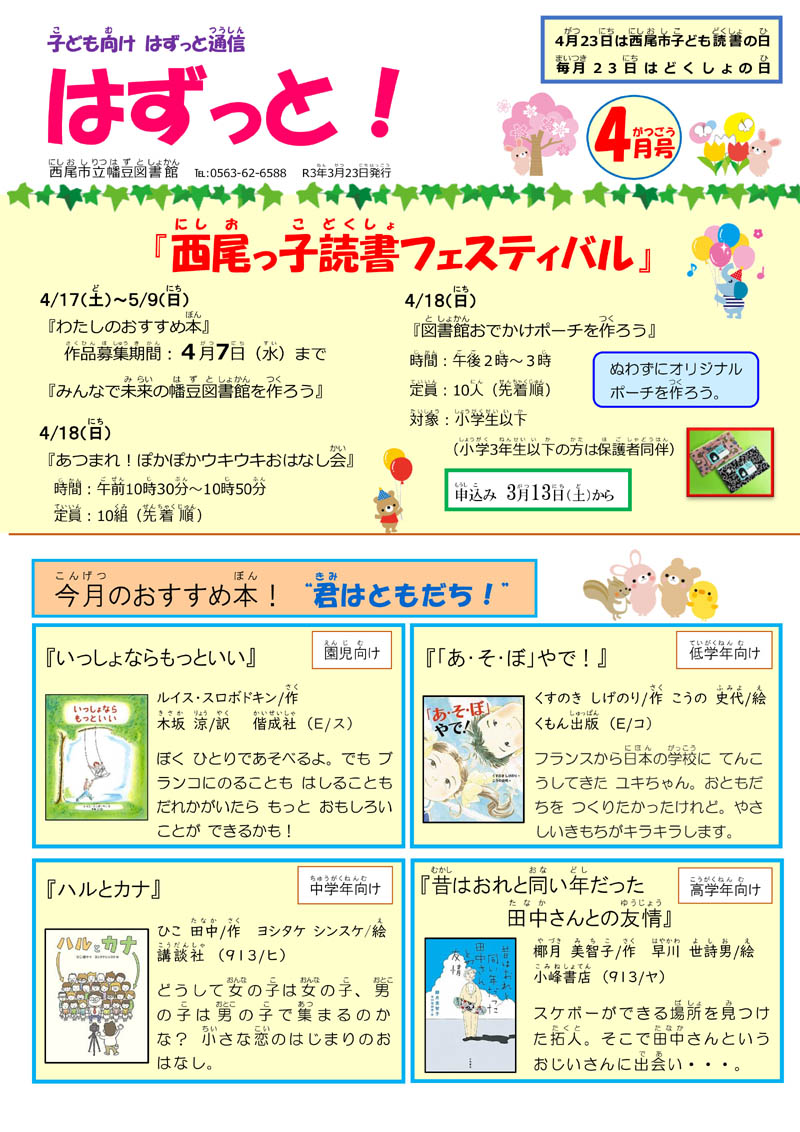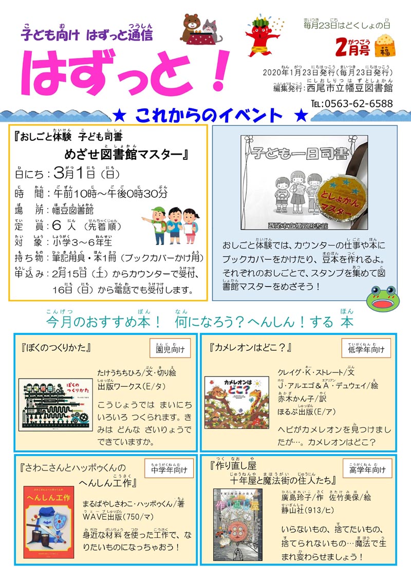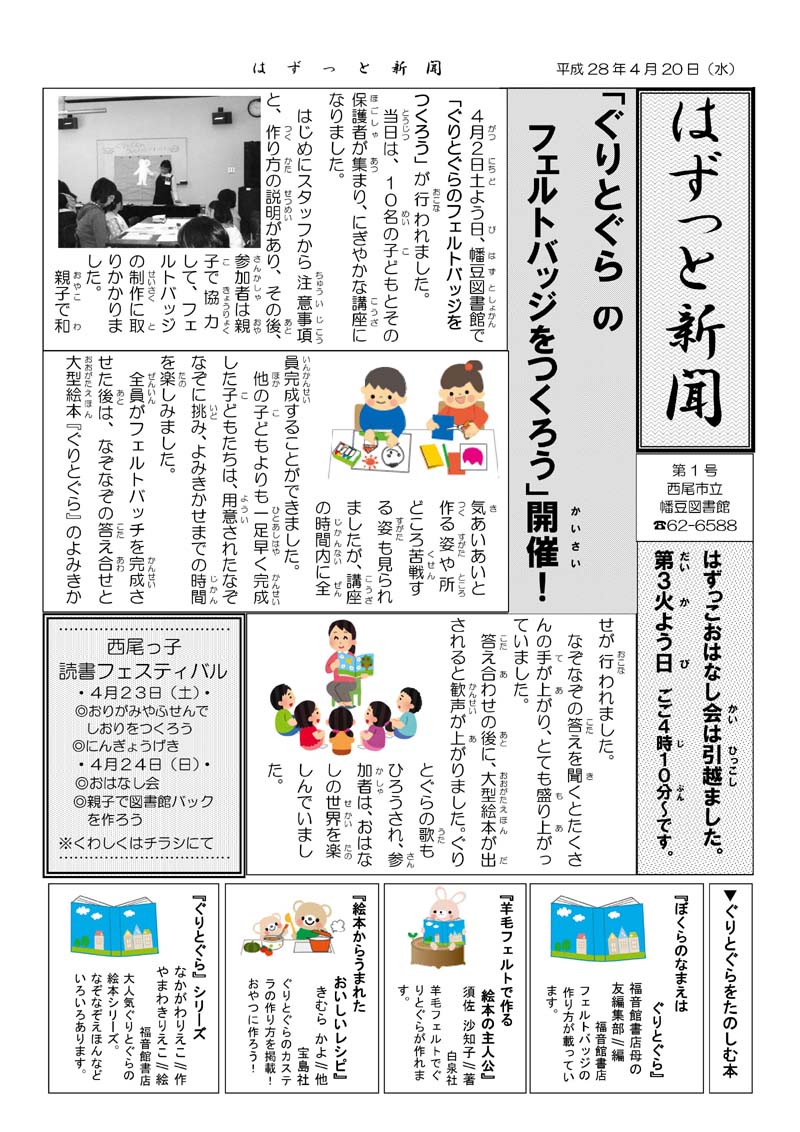 | 平成28年4月からスタートした「はずっと新聞」(幡豆図書館こども機関誌)をホームページに掲載します。行事などを紹介します。 なお、活動している様子の写真を顔が特定できないものにしたり、イラストに差し替えたりしてありますので、ご了承ください。 |
