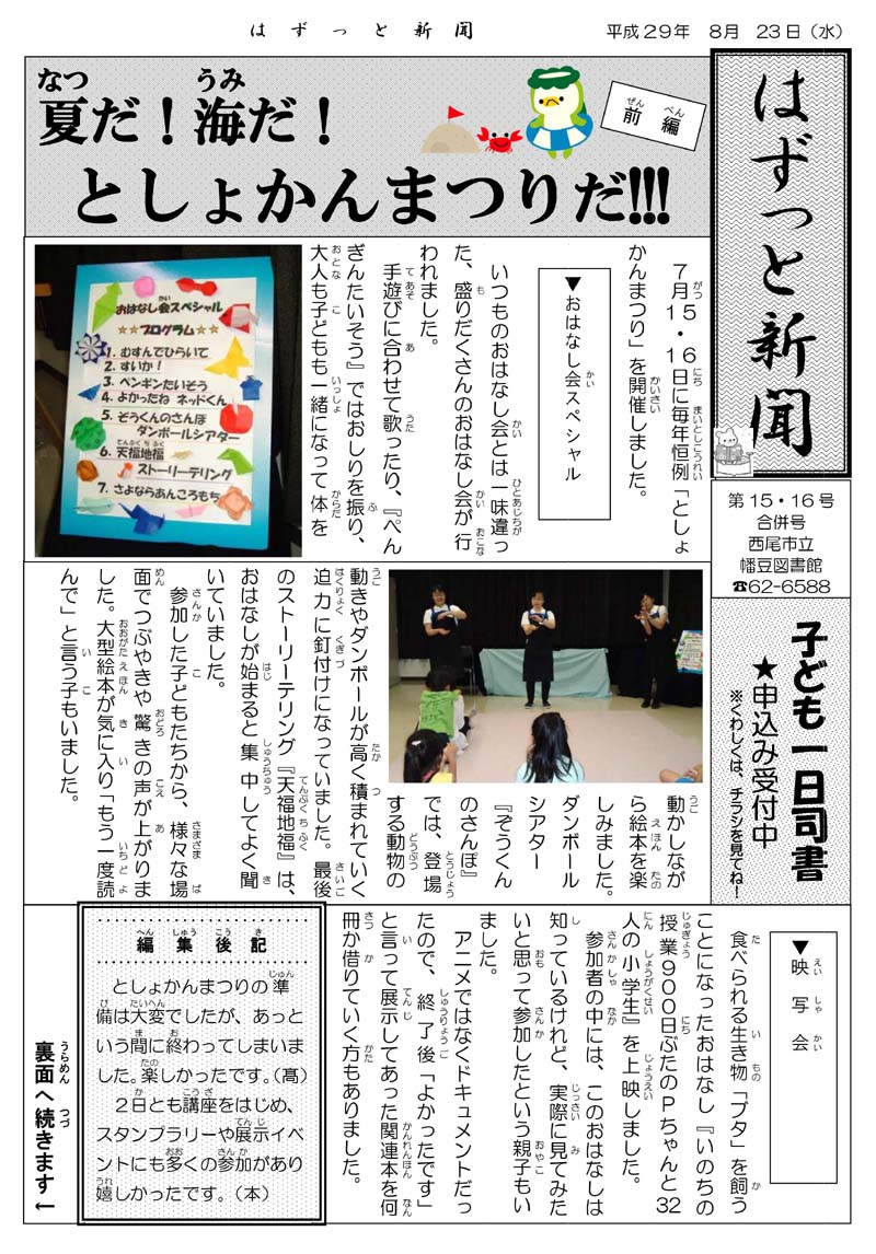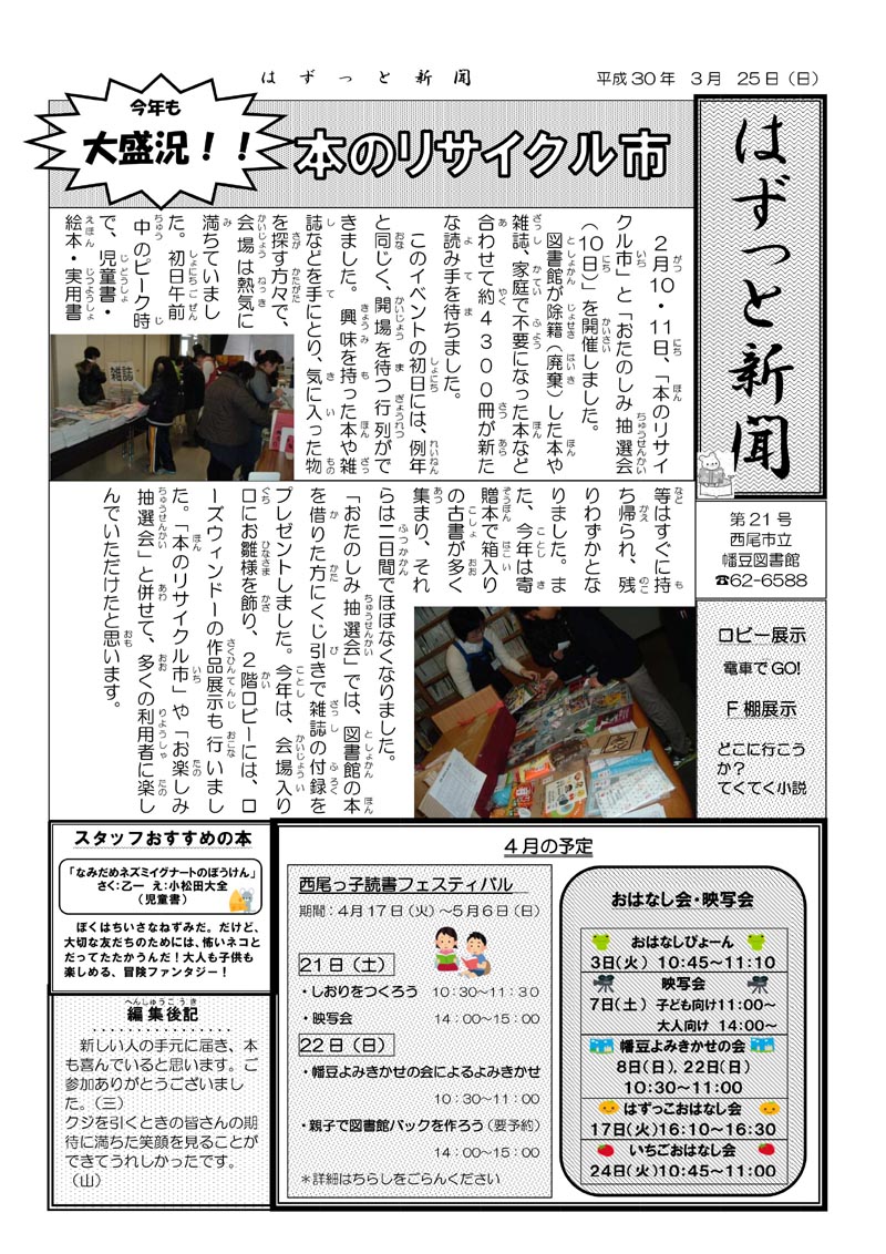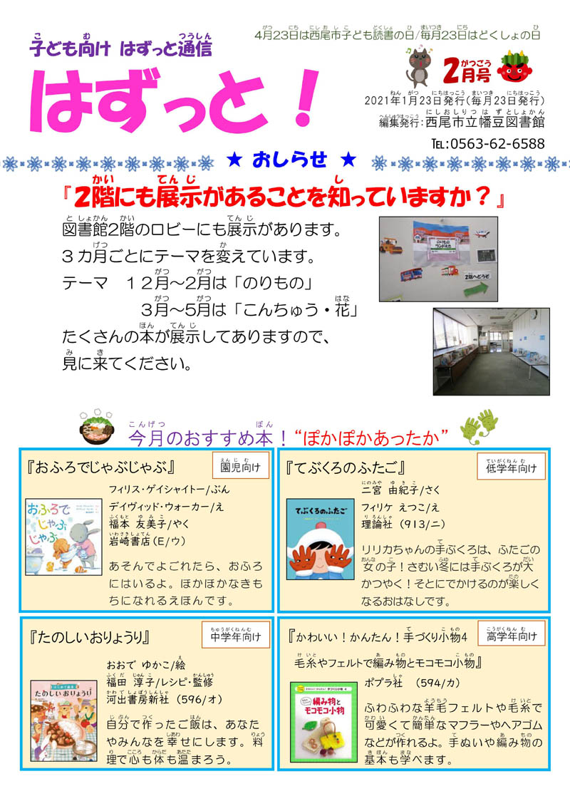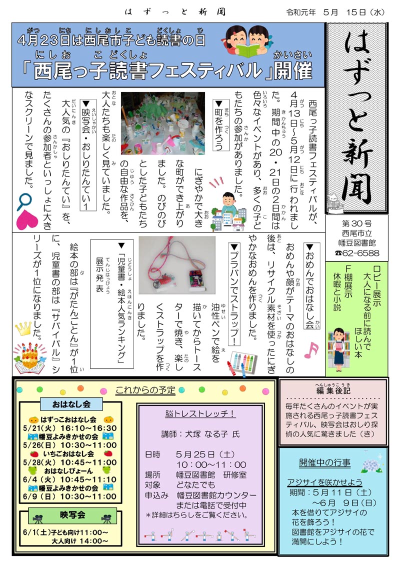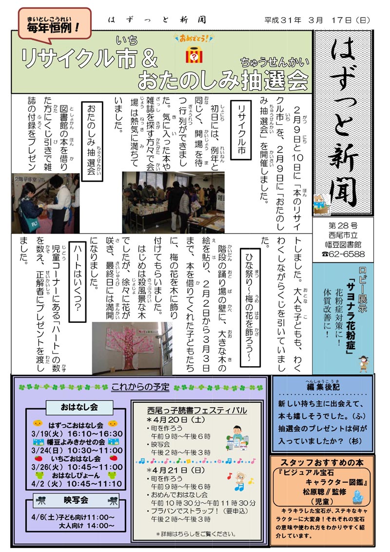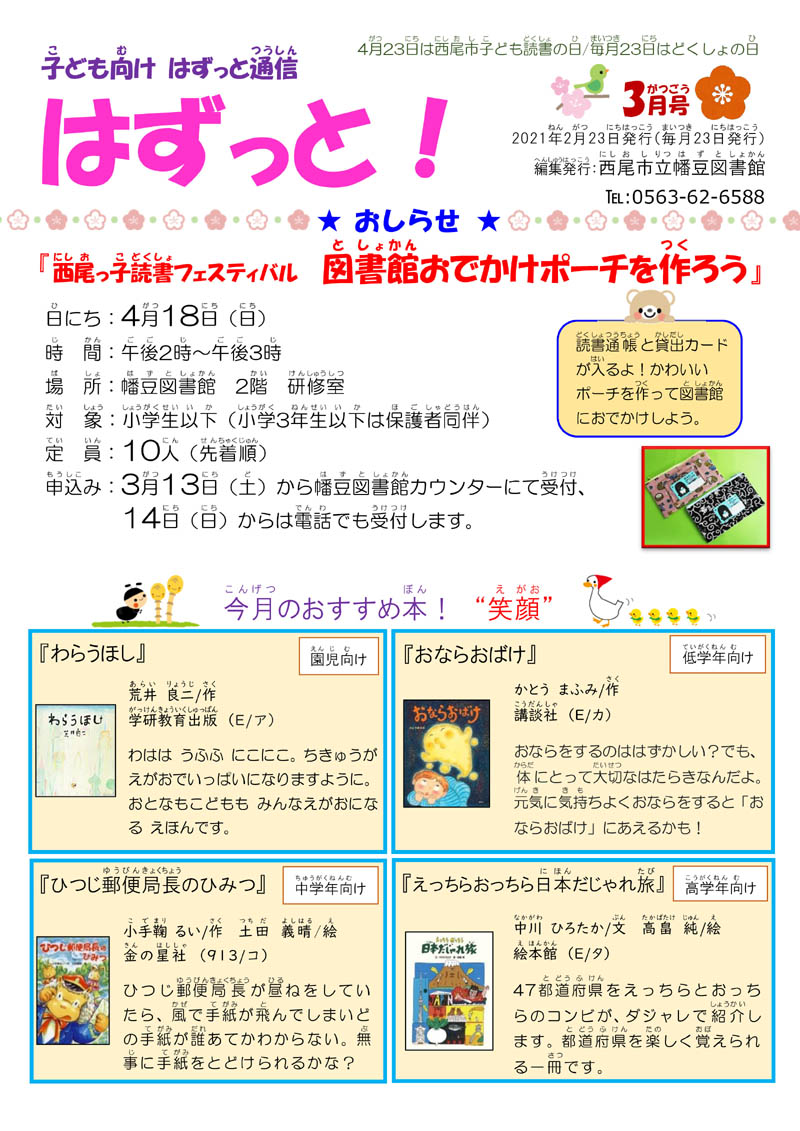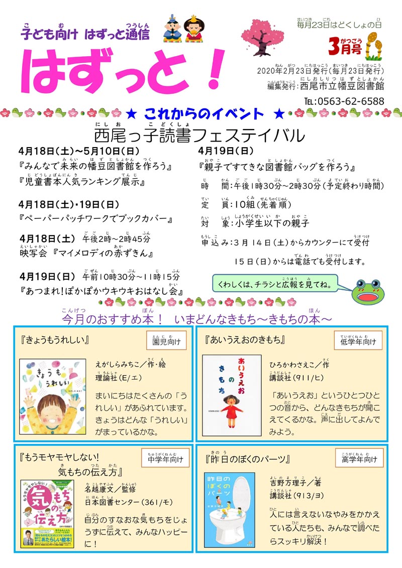 | 平成28年4月からスタートした「はずっと新聞」(幡豆図書館こども機関誌)をホームページに掲載します。行事などを紹介します。 なお、活動している様子の写真を顔が特定できないものにしたり、イラストに差し替えたりしてありますので、ご了承ください。 |