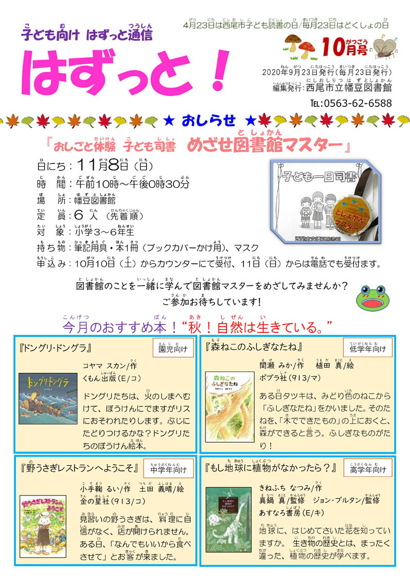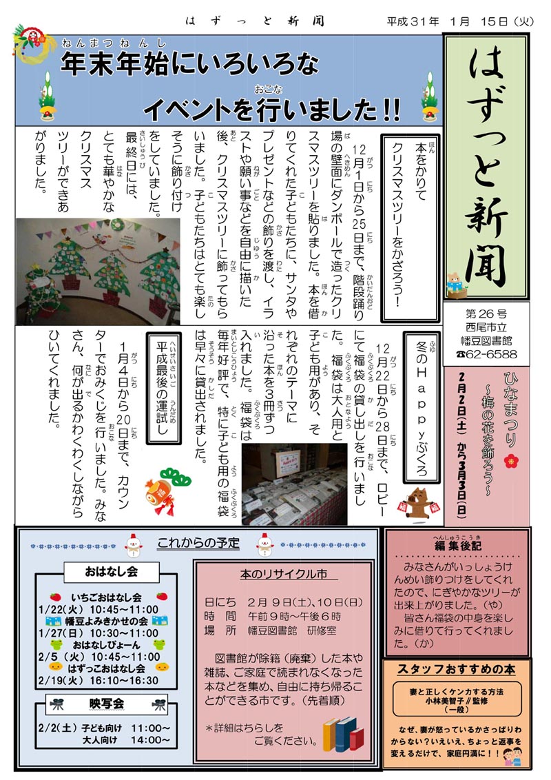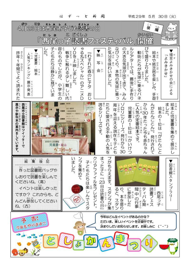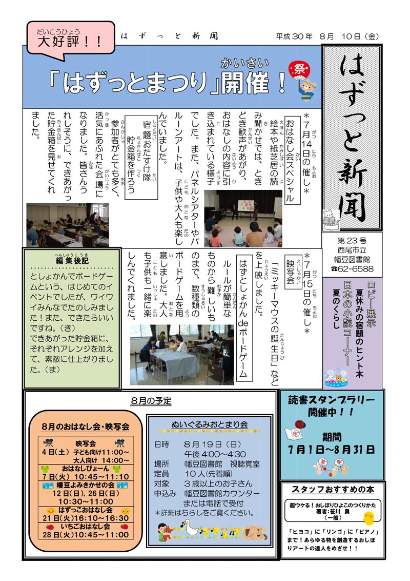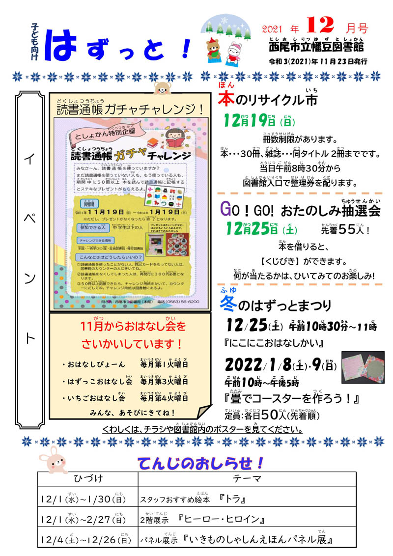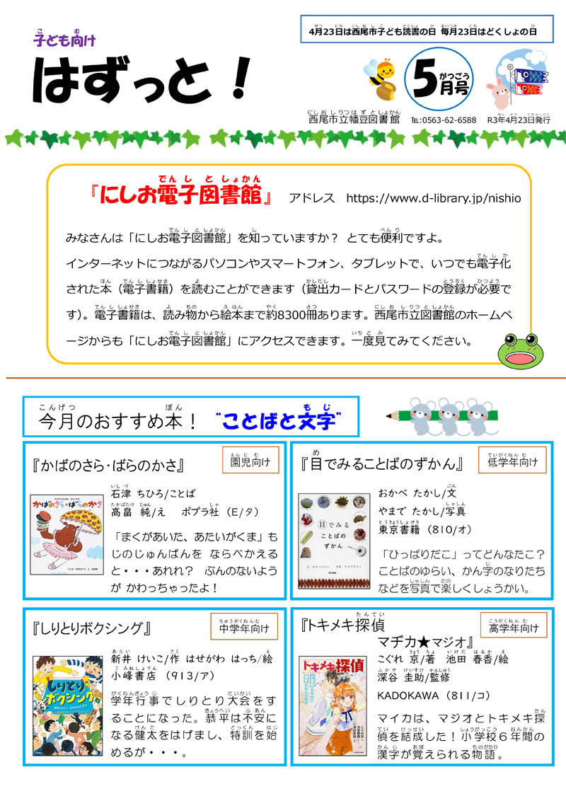 | 平成28年4月からスタートした「はずっと新聞」(幡豆図書館こども機関誌)をホームページに掲載します。行事などを紹介します。 なお、活動している様子の写真を顔が特定できないものにしたり、イラストに差し替えたりしてありますので、ご了承ください。 |