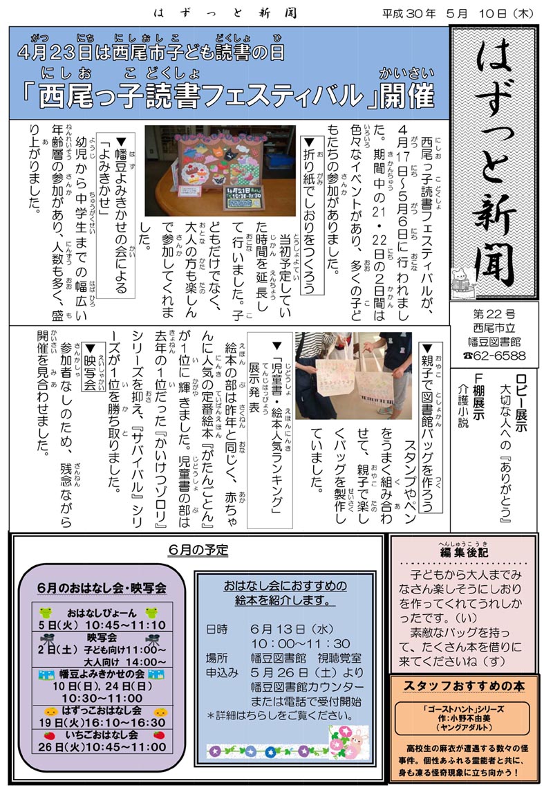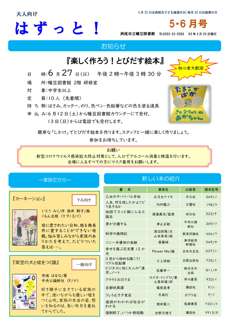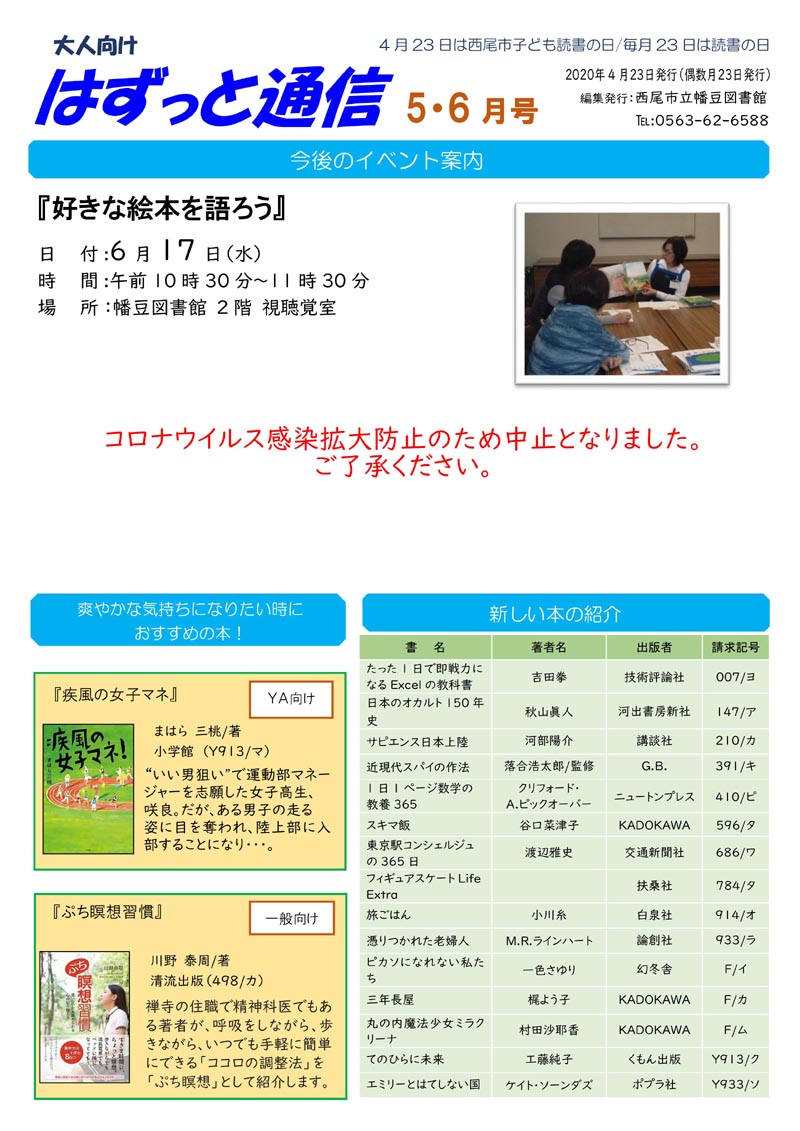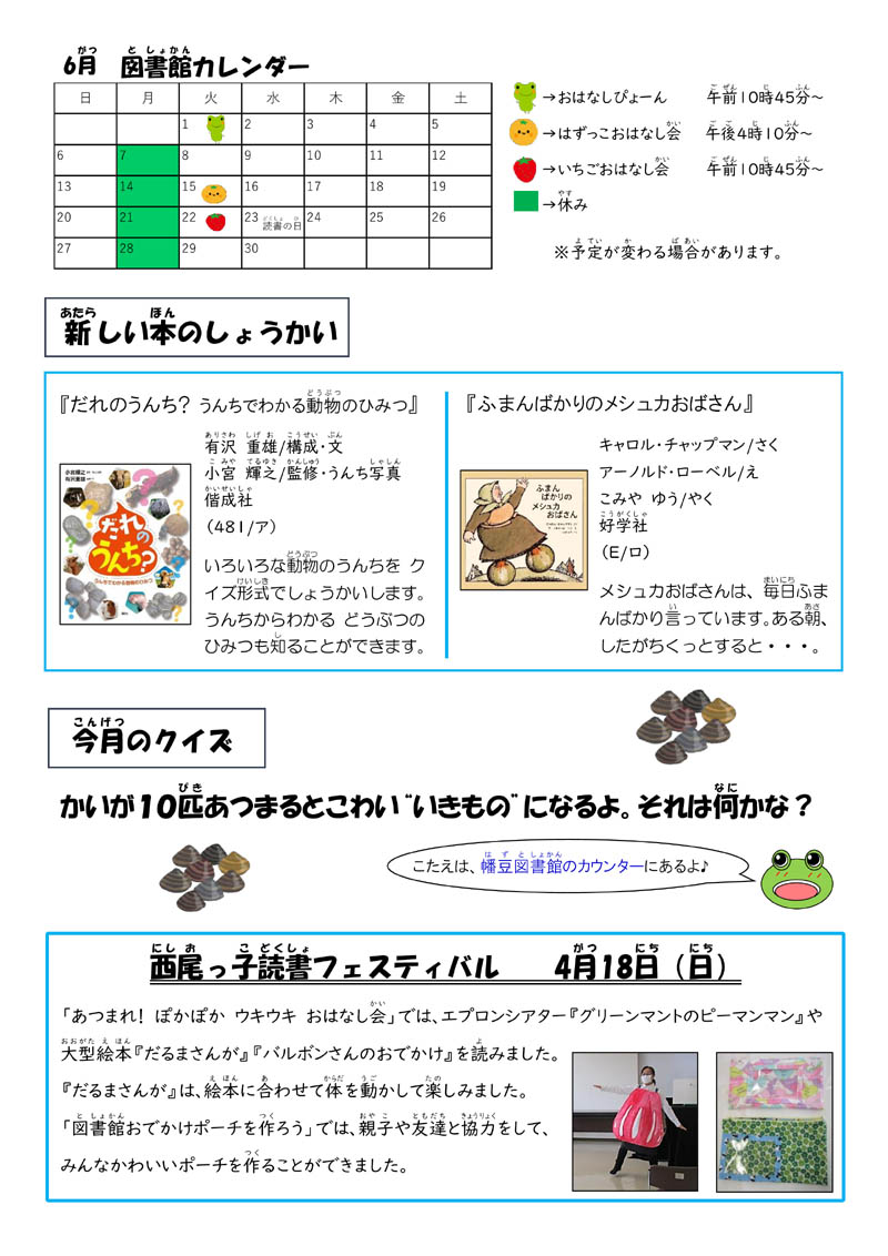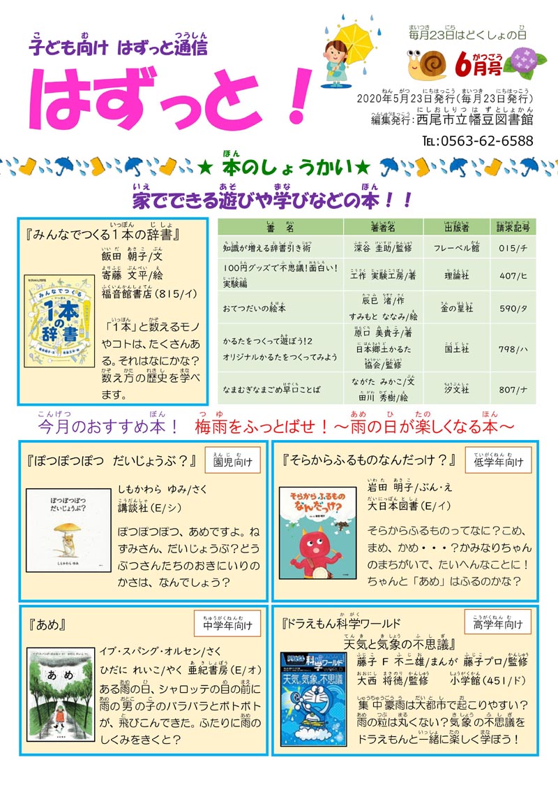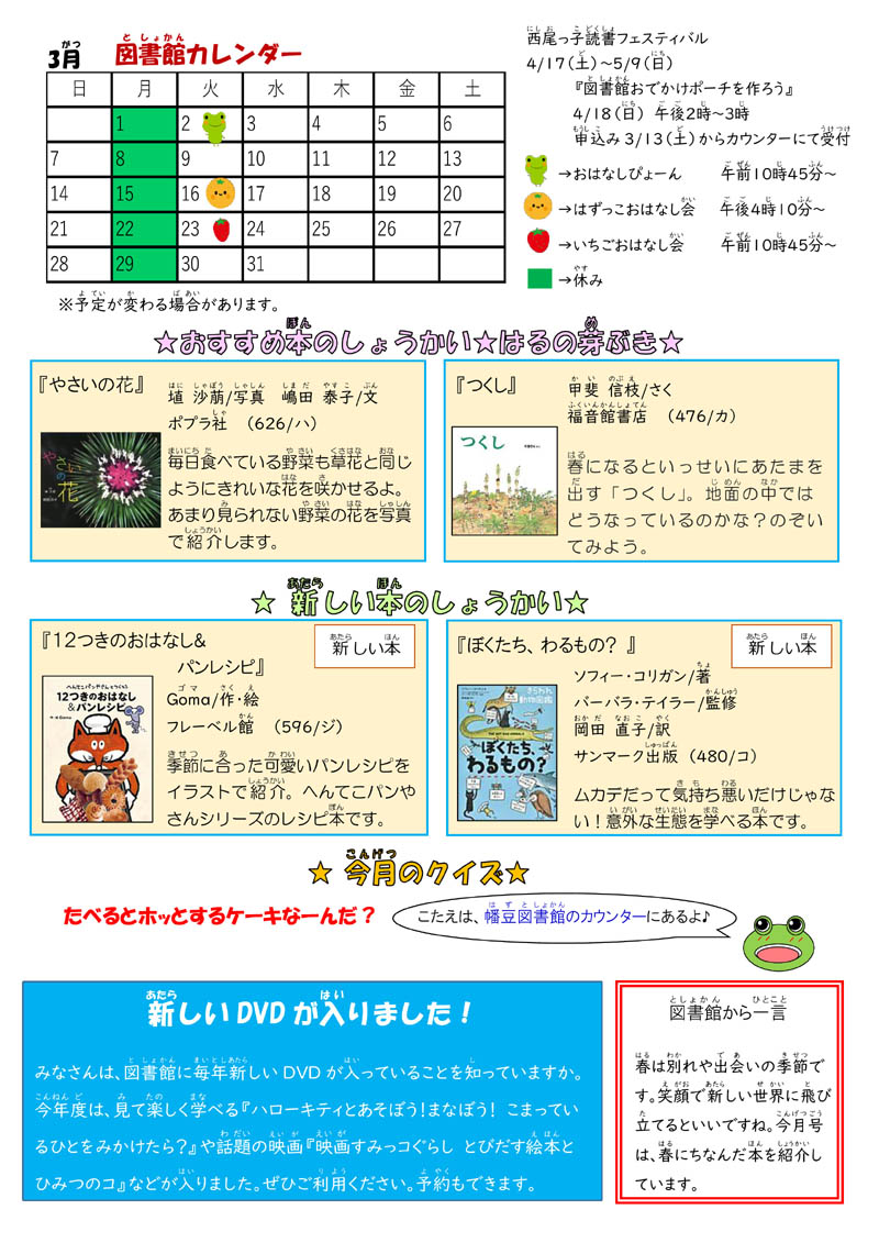 | 平成28年4月からスタートした「はずっと新聞」(幡豆図書館こども機関誌)をホームページに掲載します。行事などを紹介します。 なお、活動している様子の写真を顔が特定できないものにしたり、イラストに差し替えたりしてありますので、ご了承ください。 |