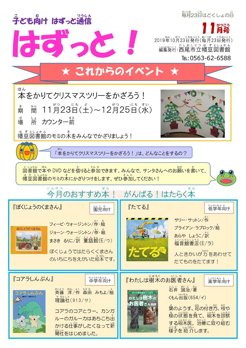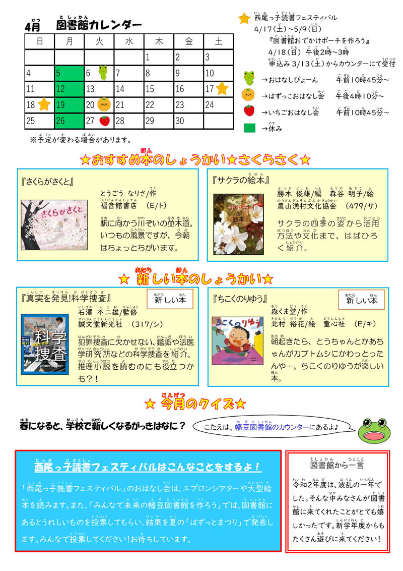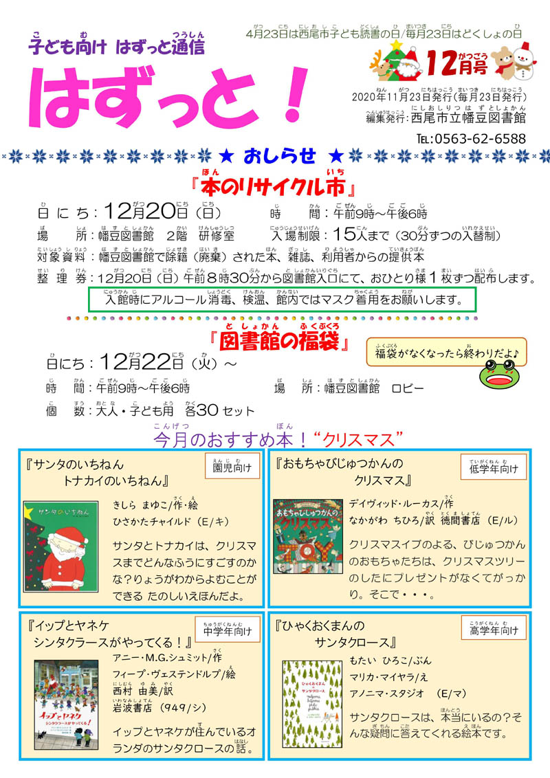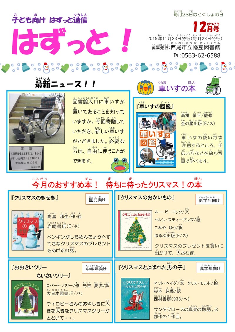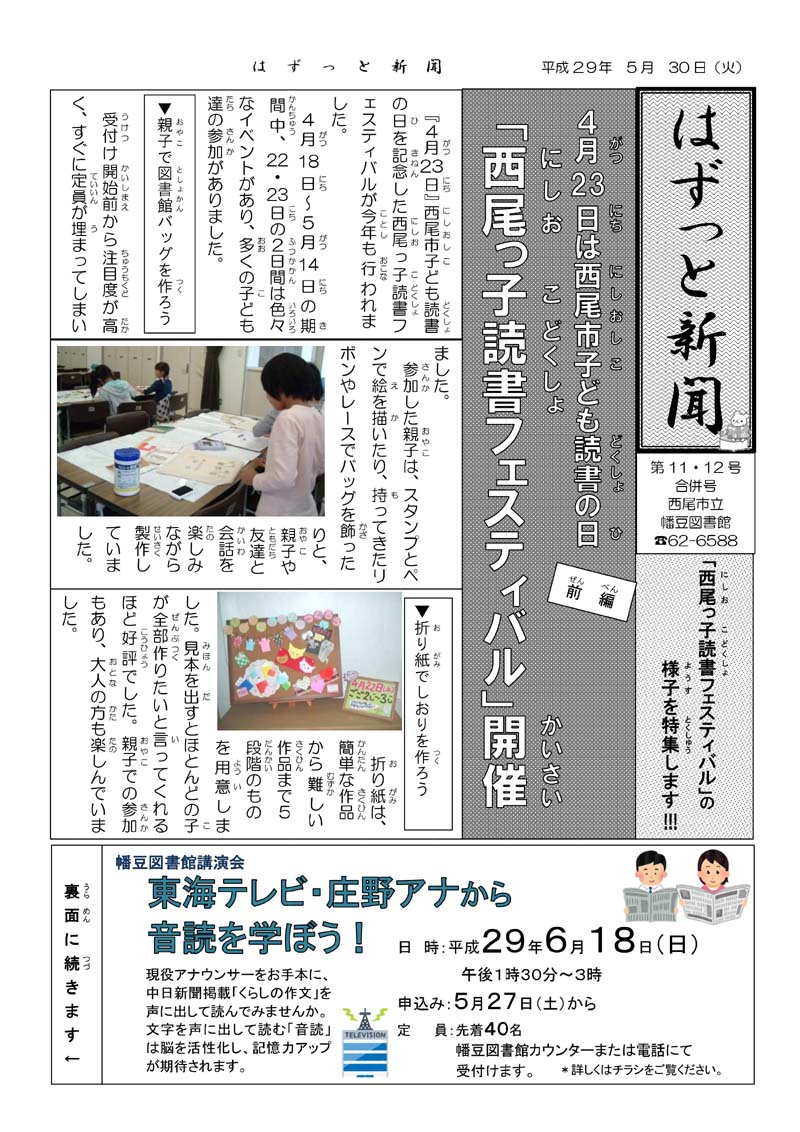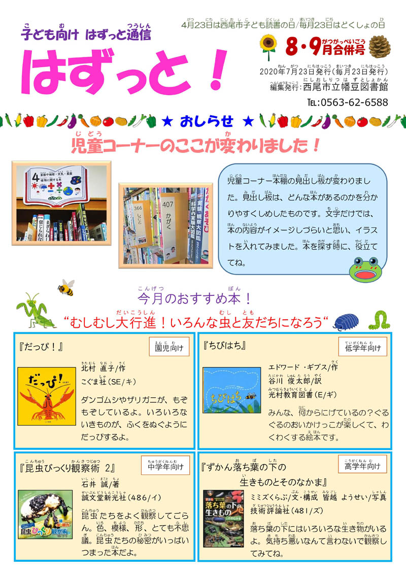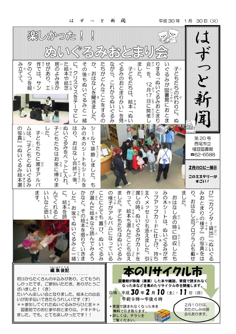 | 平成28年4月からスタートした「はずっと新聞」(幡豆図書館こども機関誌)をホームページに掲載します。行事などを紹介します。 なお、活動している様子の写真を顔が特定できないものにしたり、イラストに差し替えたりしてありますので、ご了承ください。 |