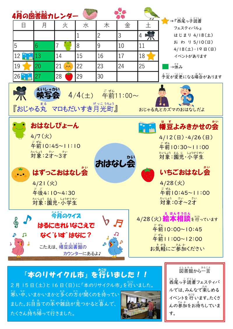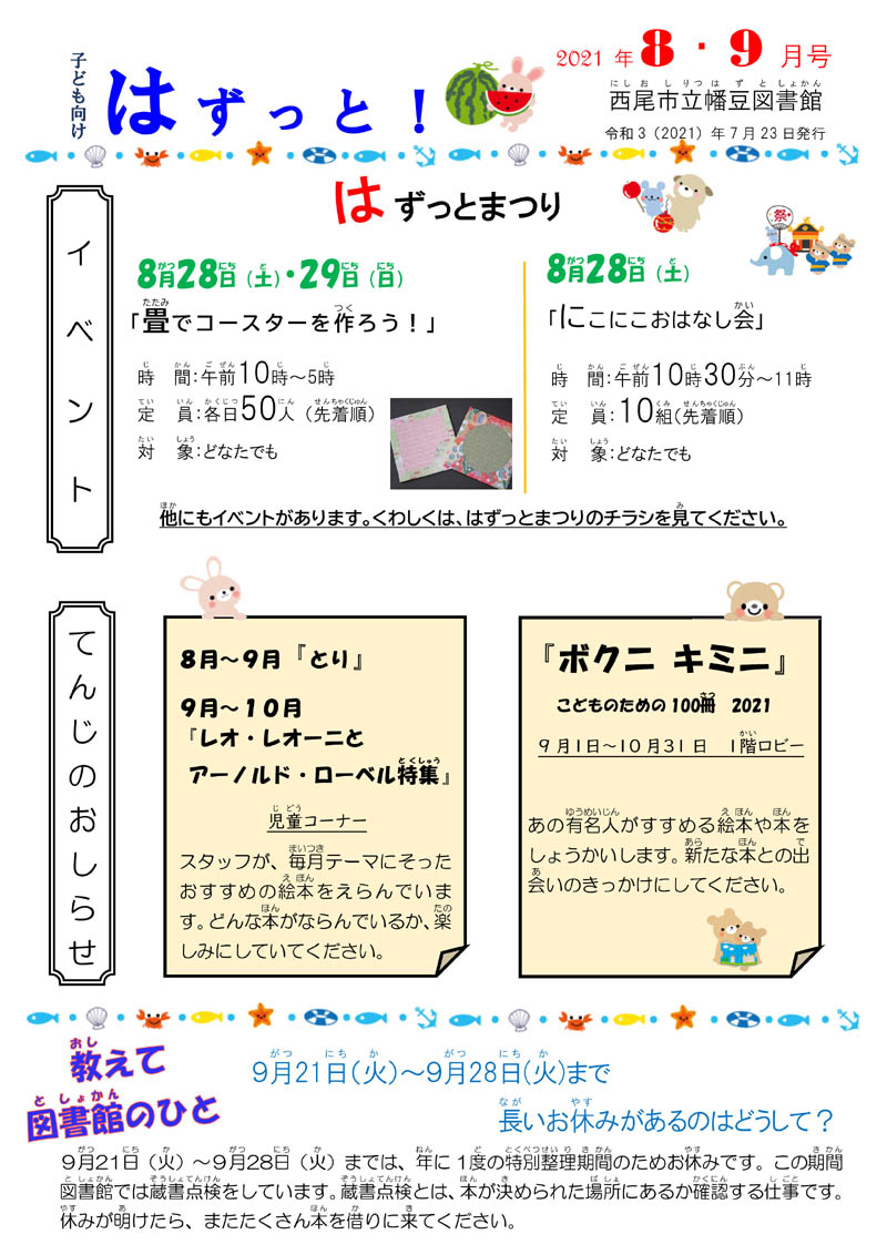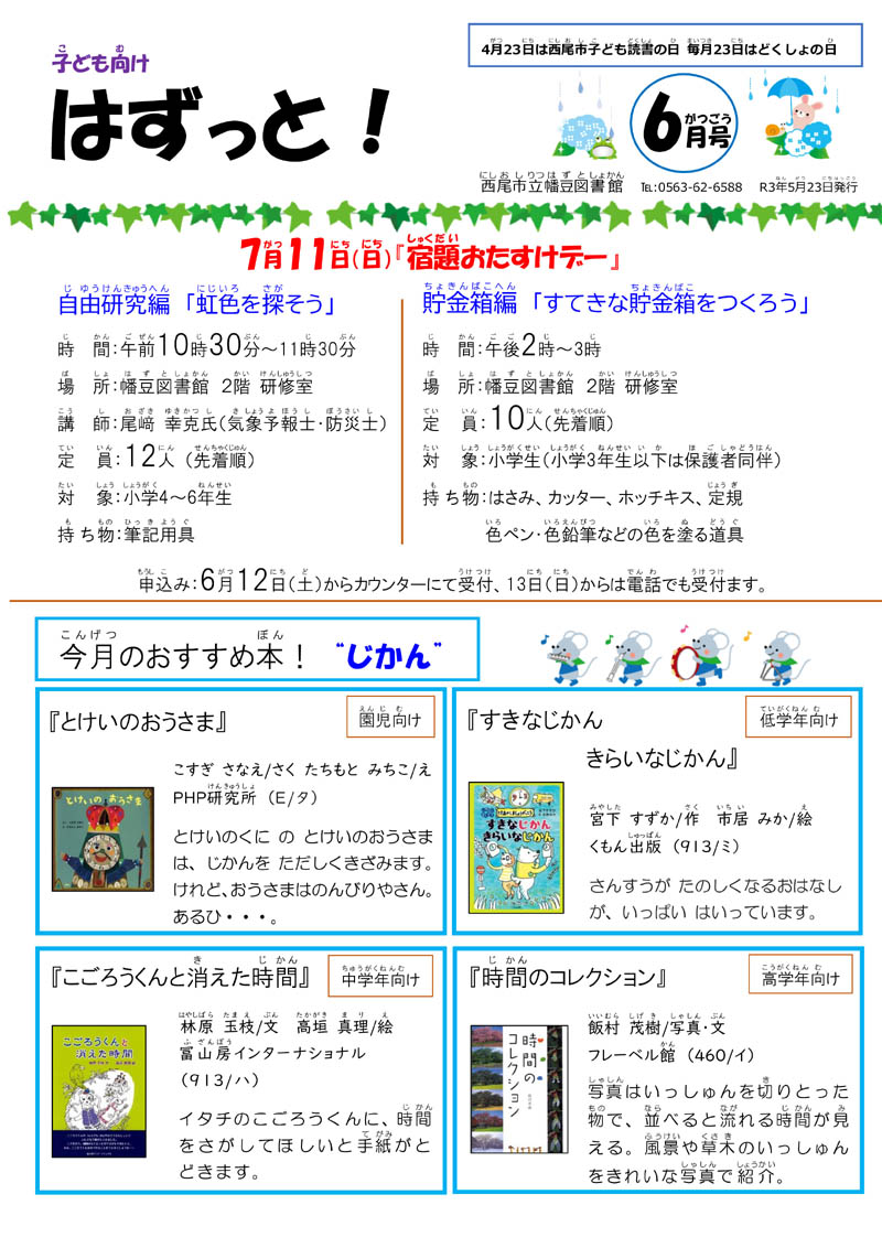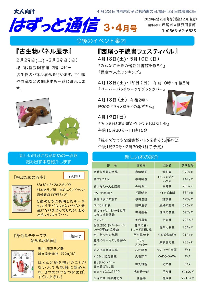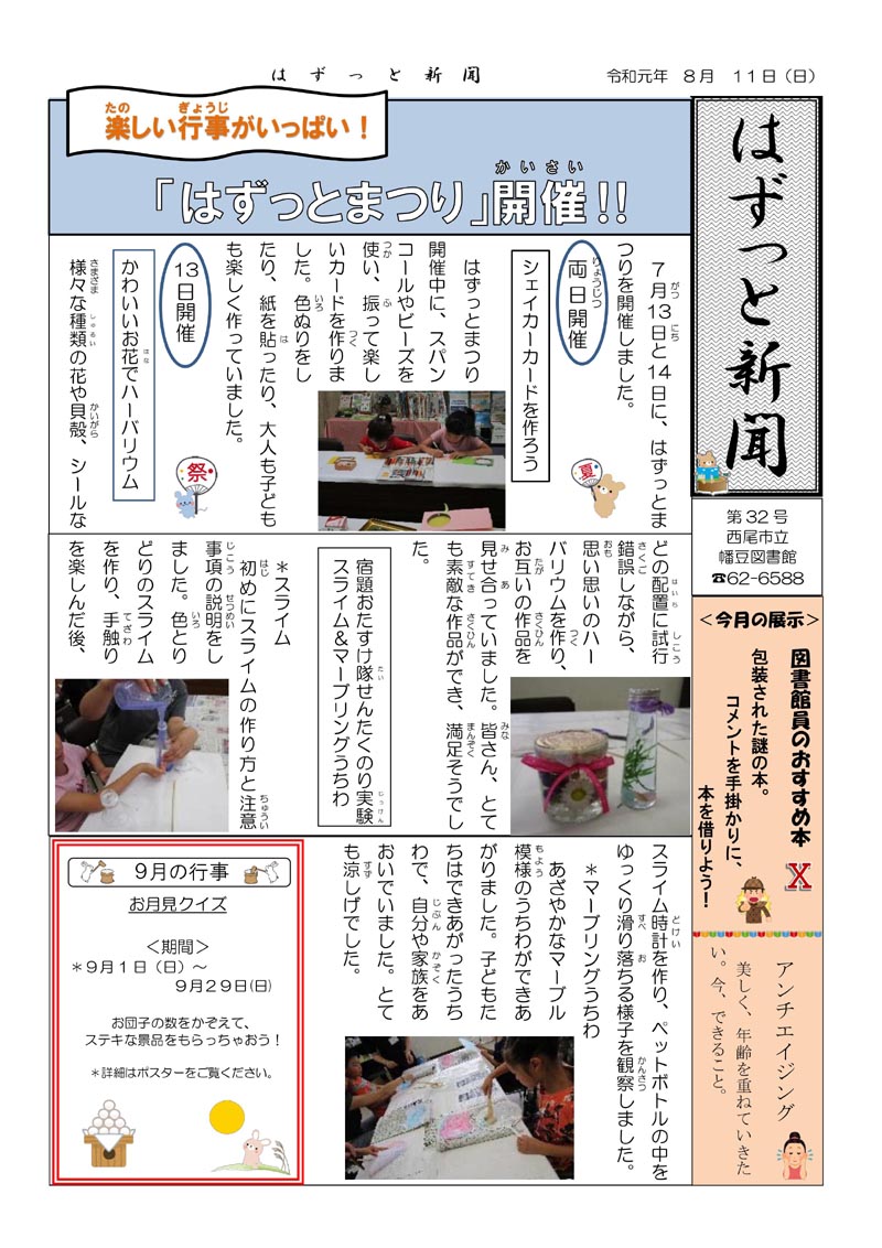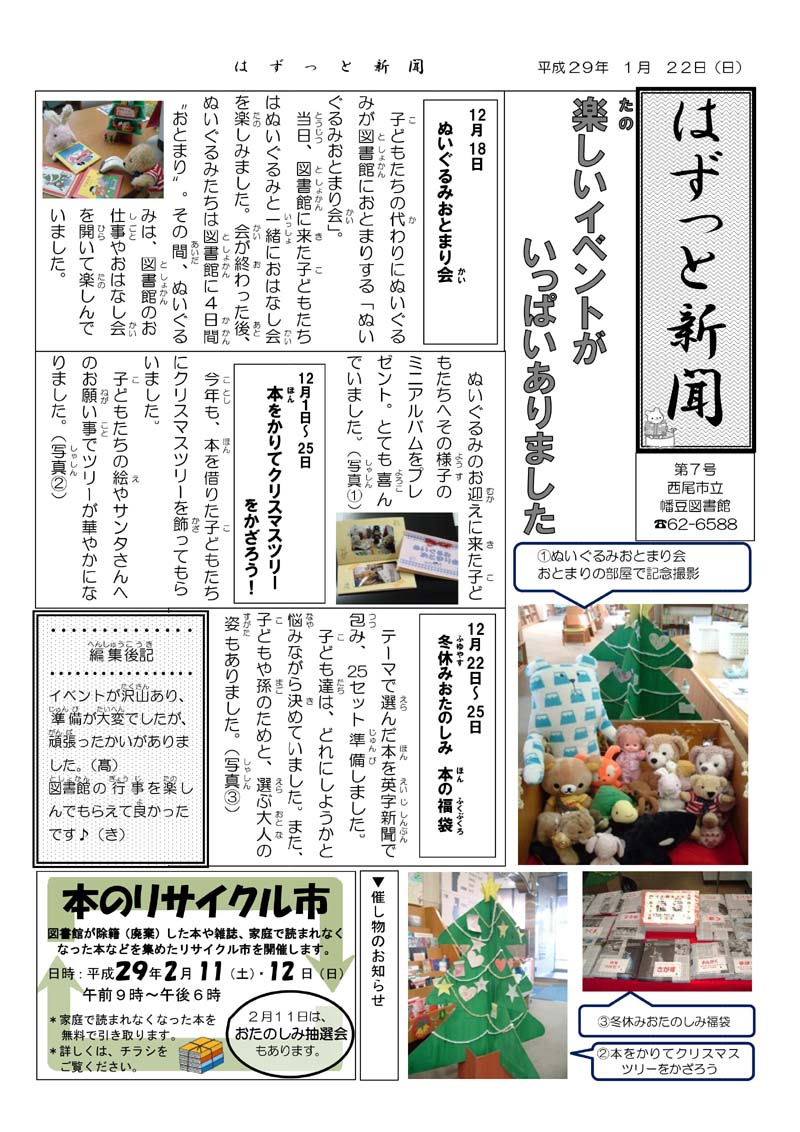 | 平成28年4月からスタートした「はずっと新聞」(幡豆図書館こども機関誌)をホームページに掲載します。行事などを紹介します。 なお、活動している様子の写真を顔が特定できないものにしたり、イラストに差し替えたりしてありますので、ご了承ください。 |