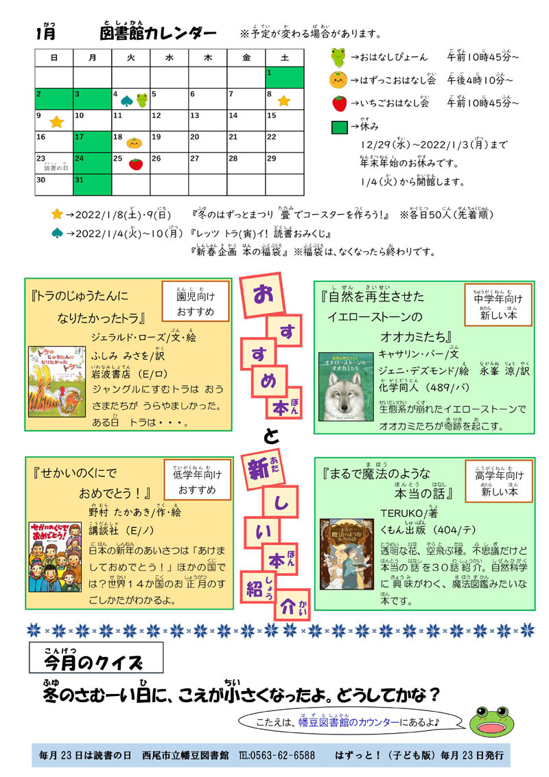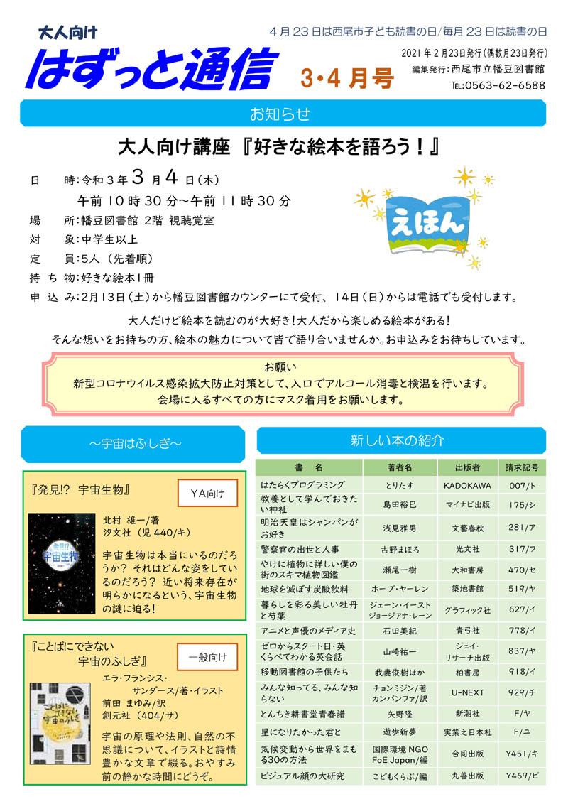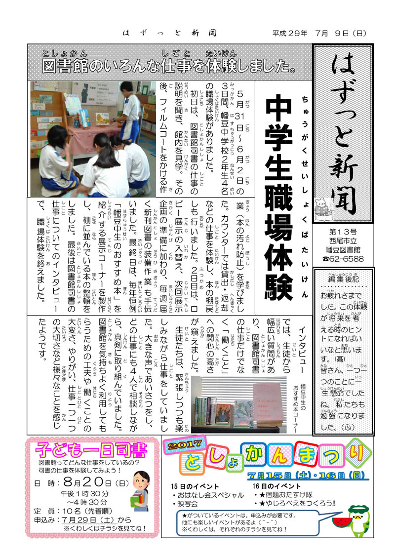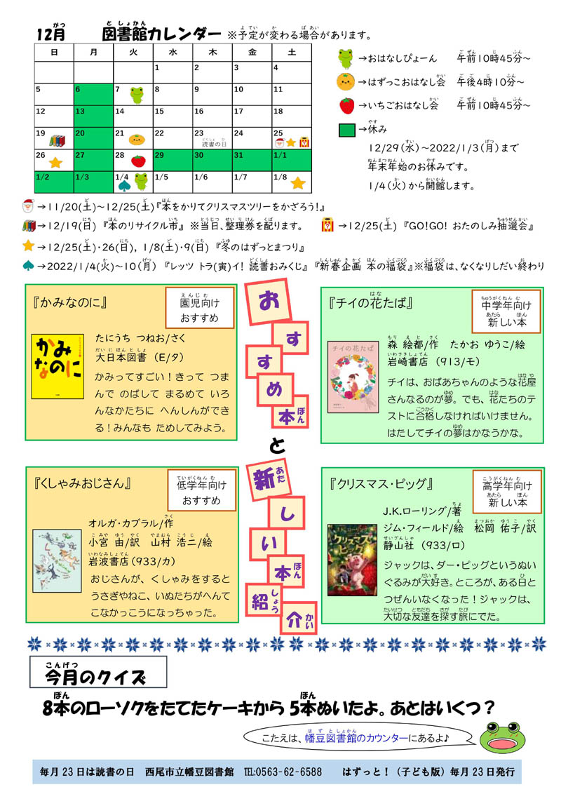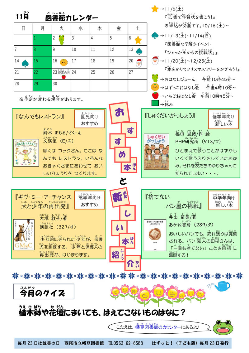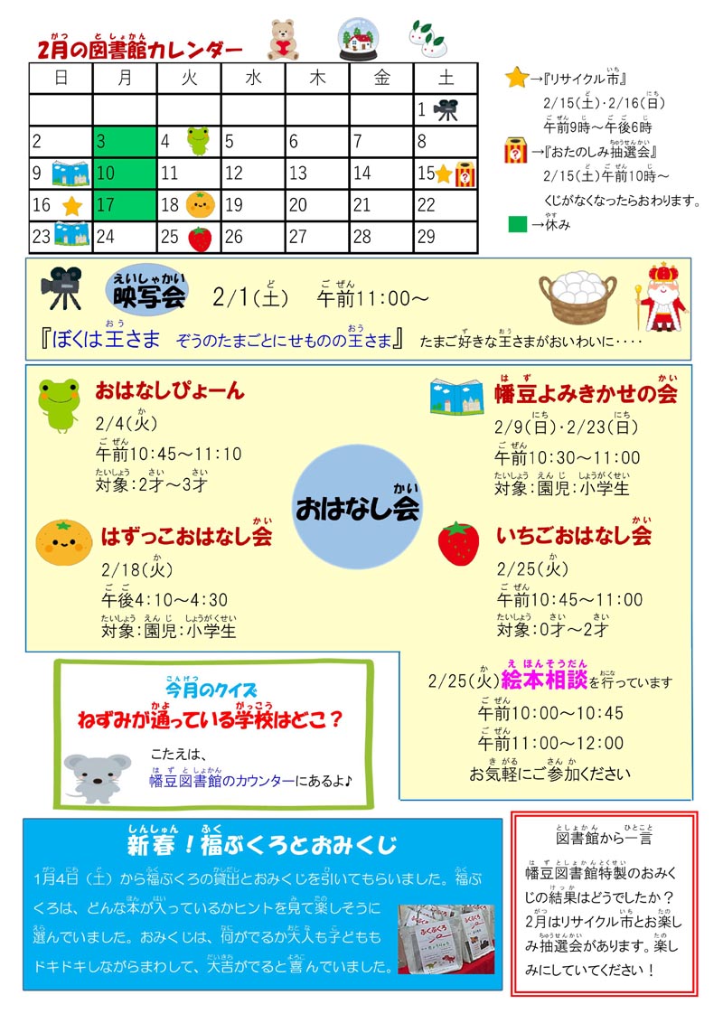 | 平成28年4月からスタートした「はずっと新聞」(幡豆図書館こども機関誌)をホームページに掲載します。行事などを紹介します。 なお、活動している様子の写真を顔が特定できないものにしたり、イラストに差し替えたりしてありますので、ご了承ください。 |
