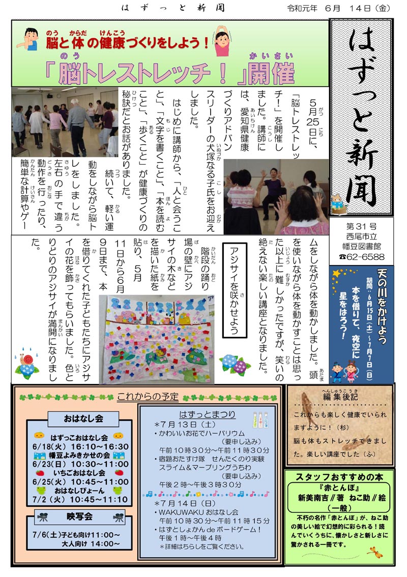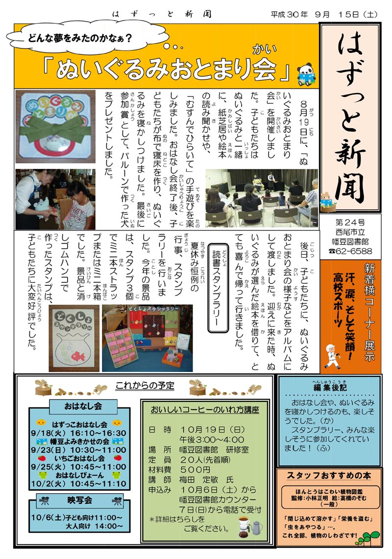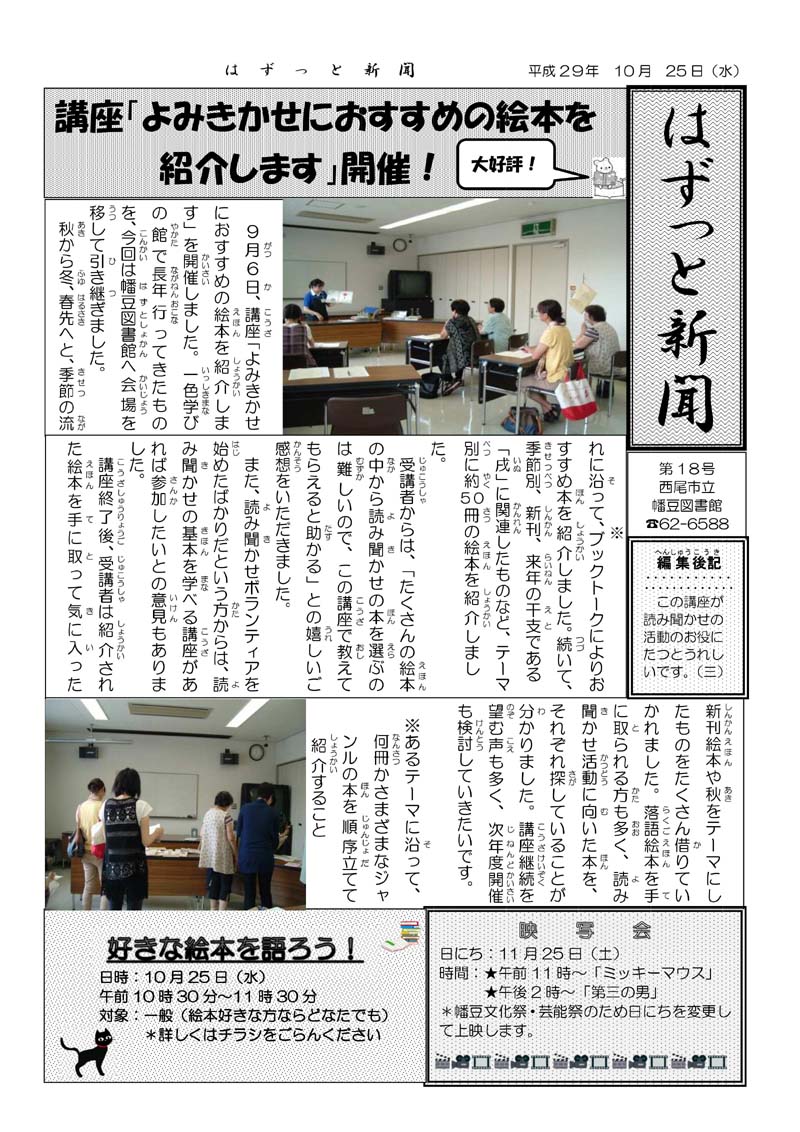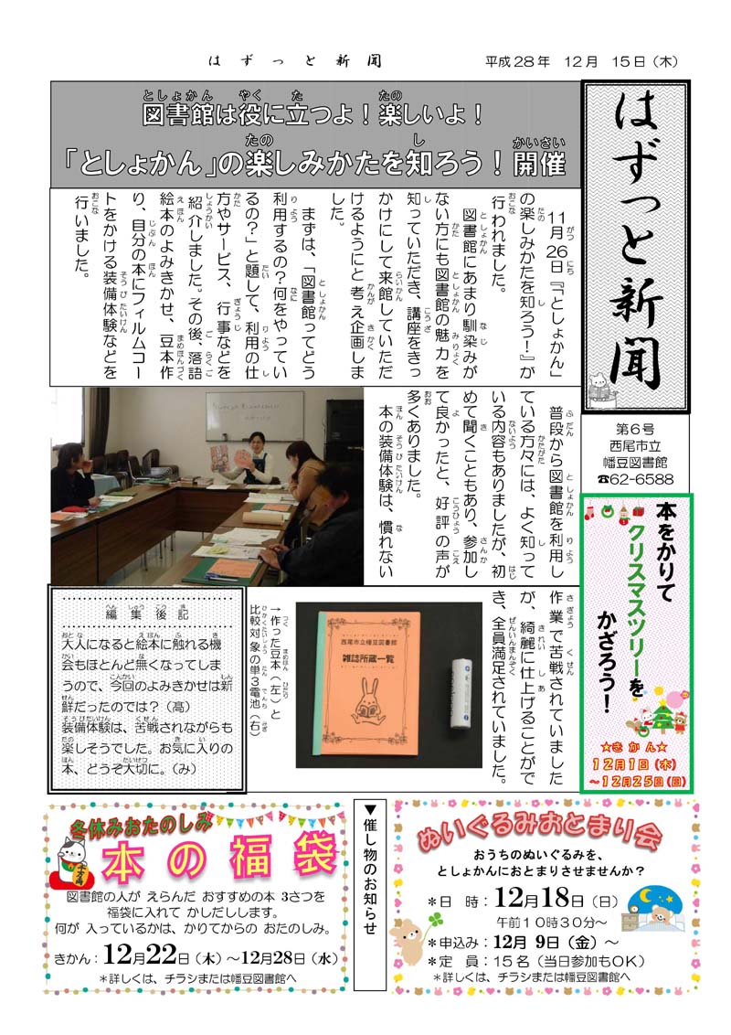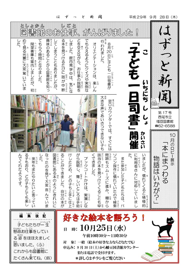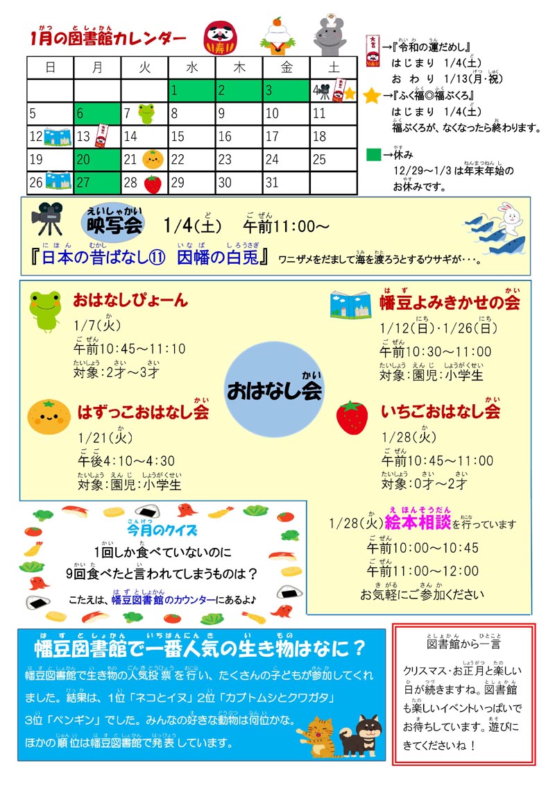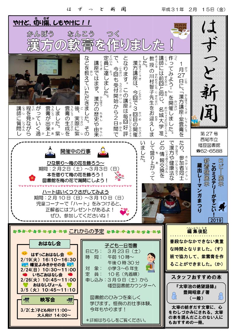 | 平成28年4月からスタートした「はずっと新聞」(幡豆図書館こども機関誌)をホームページに掲載します。行事などを紹介します。 なお、活動している様子の写真を顔が特定できないものにしたり、イラストに差し替えたりしてありますので、ご了承ください。 |