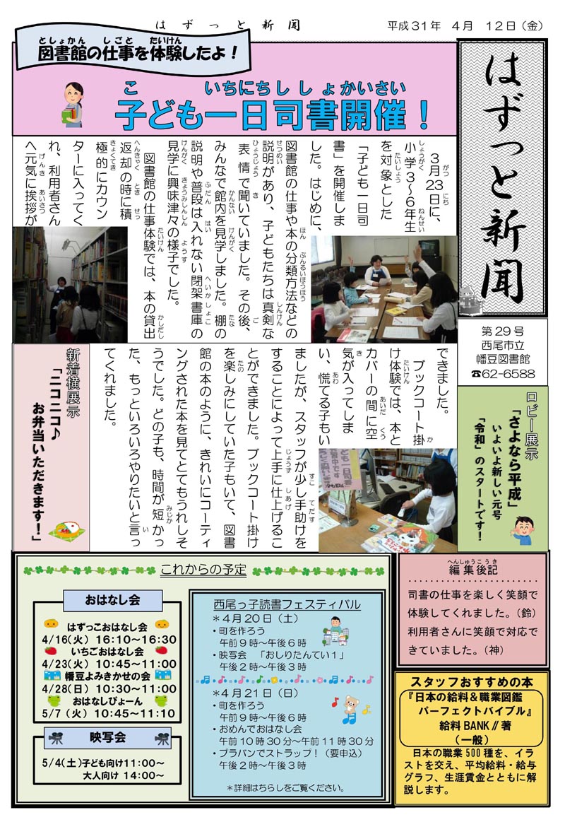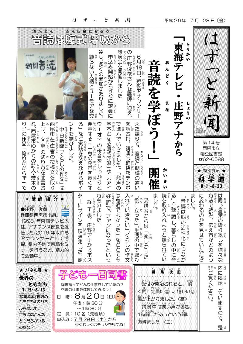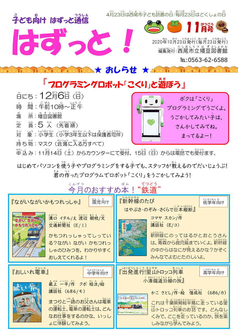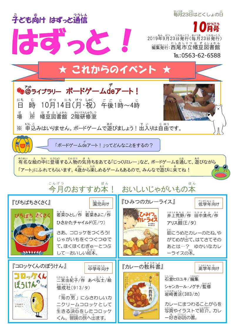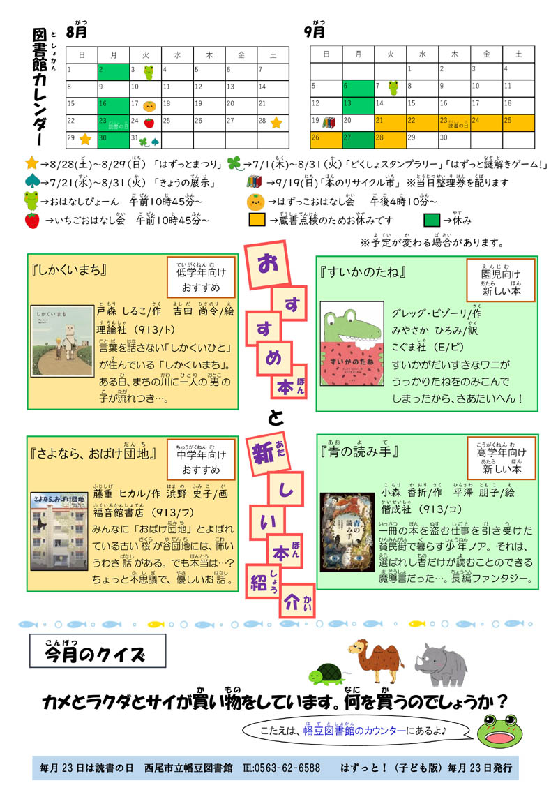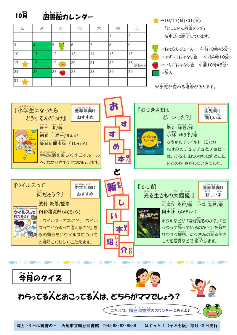 | 平成28年4月からスタートした「はずっと新聞」(幡豆図書館こども機関誌)をホームページに掲載します。行事などを紹介します。 なお、活動している様子の写真を顔が特定できないものにしたり、イラストに差し替えたりしてありますので、ご了承ください。 |