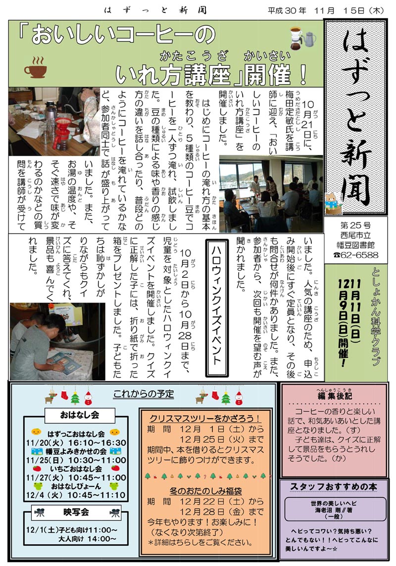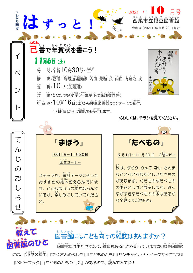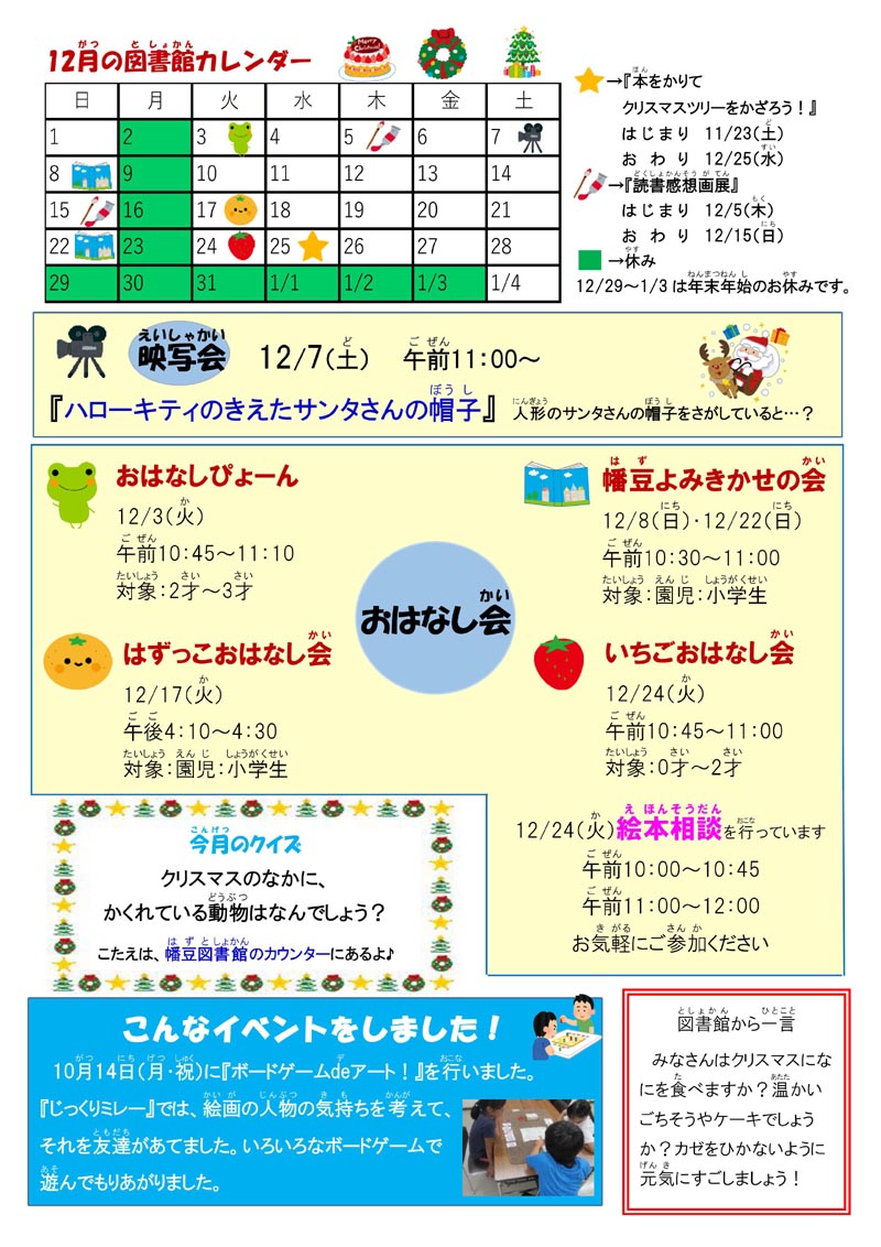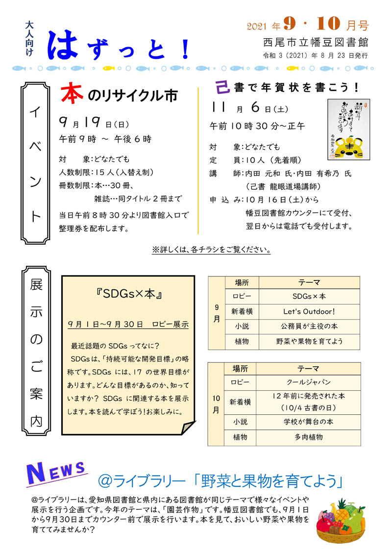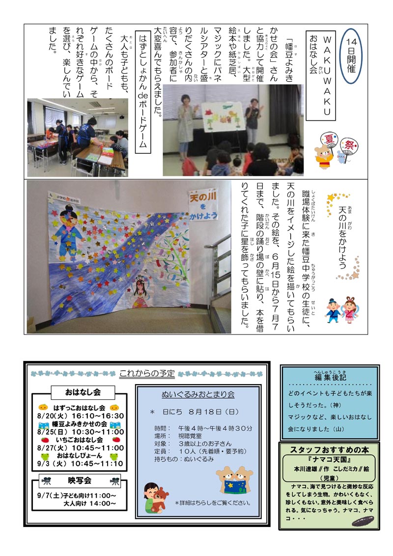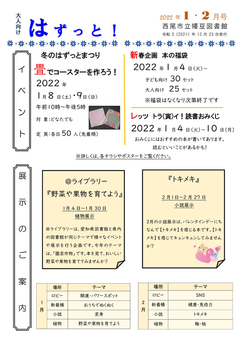 | 平成28年4月からスタートした「はずっと新聞」(幡豆図書館こども機関誌)をホームページに掲載します。行事などを紹介します。 なお、活動している様子の写真を顔が特定できないものにしたり、イラストに差し替えたりしてありますので、ご了承ください。 |