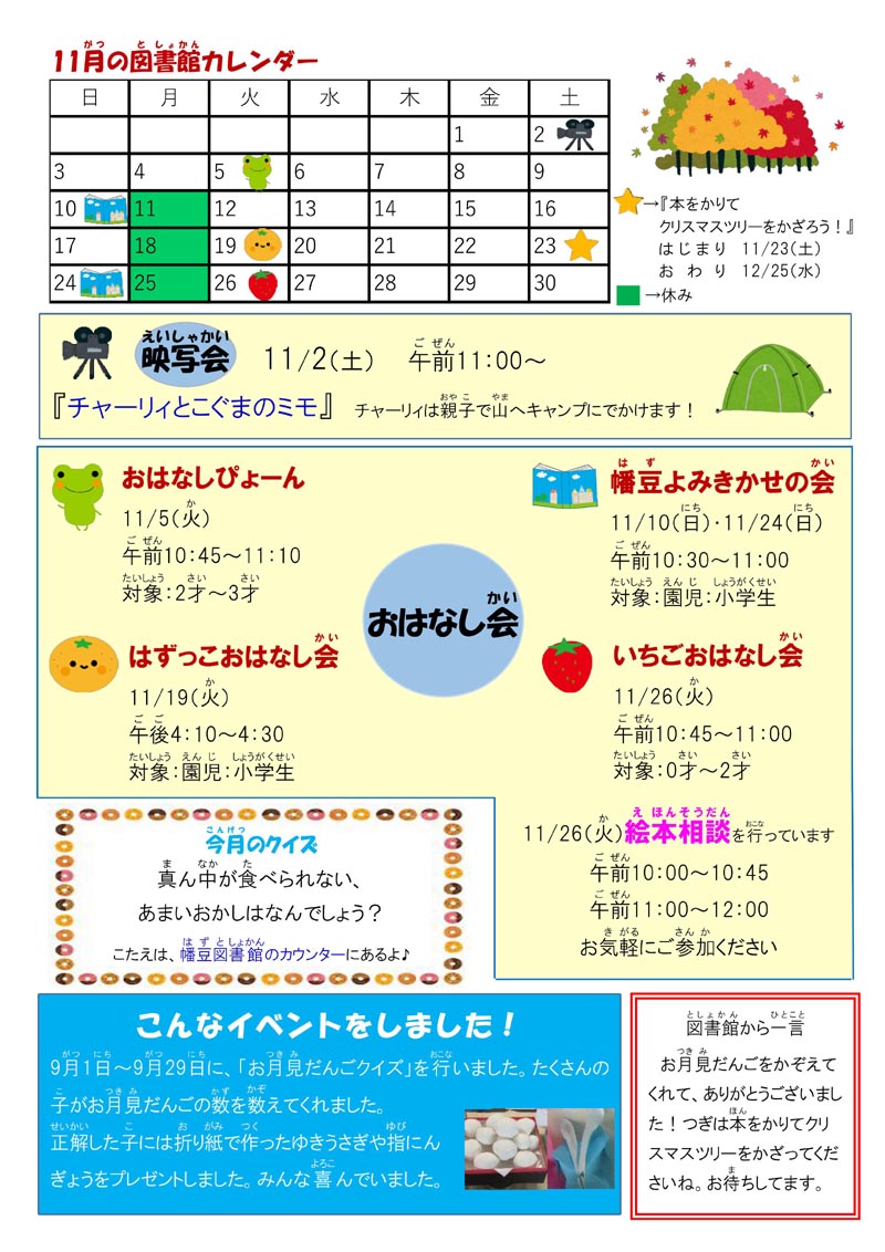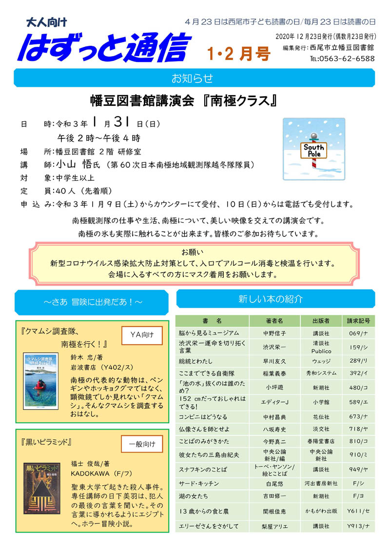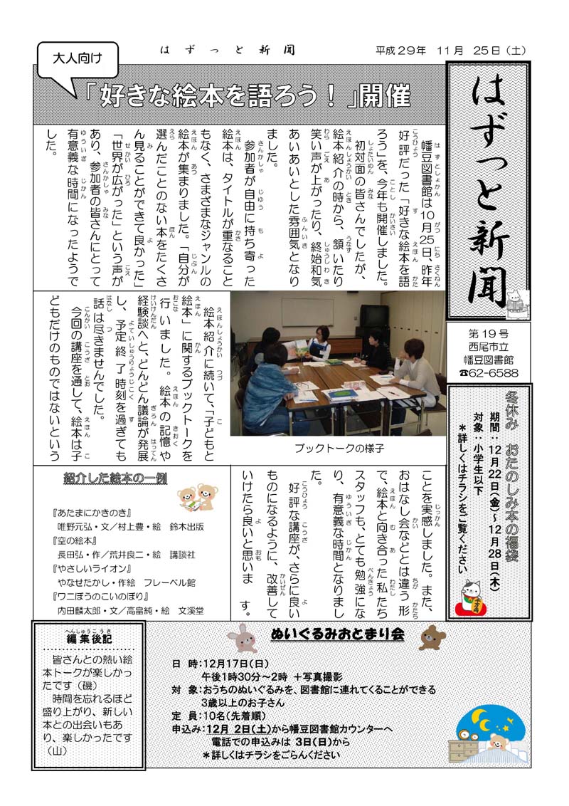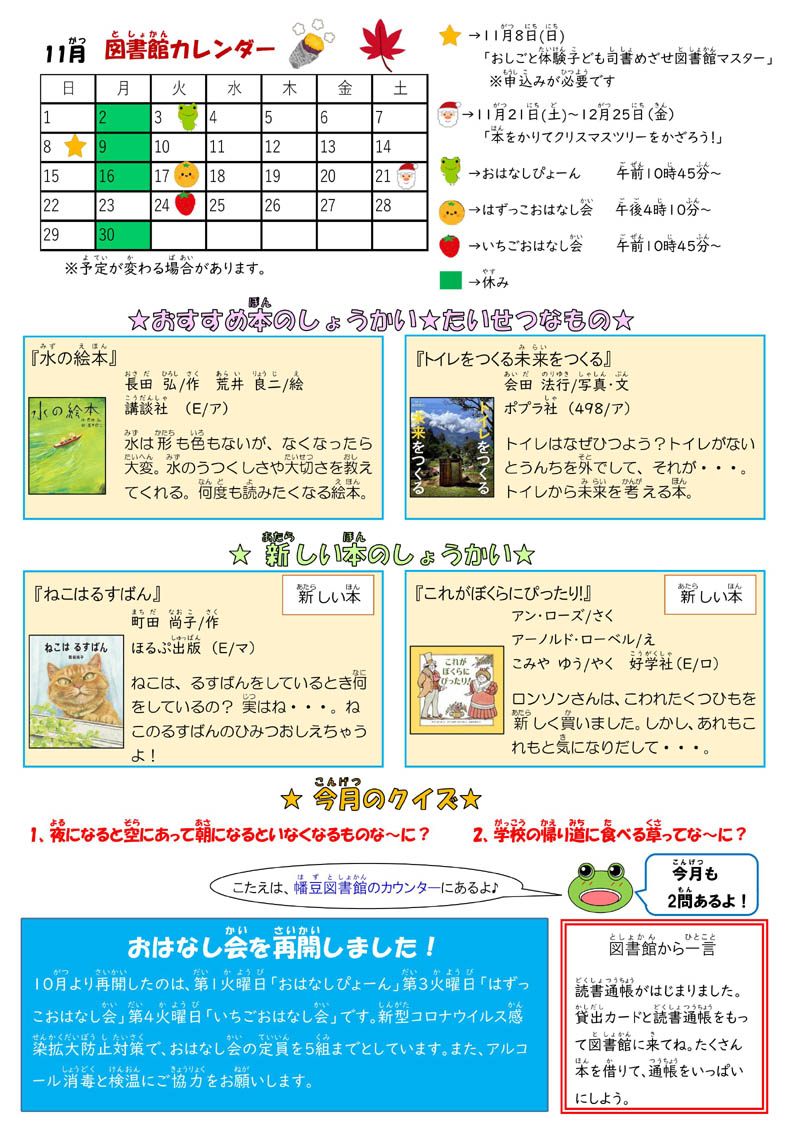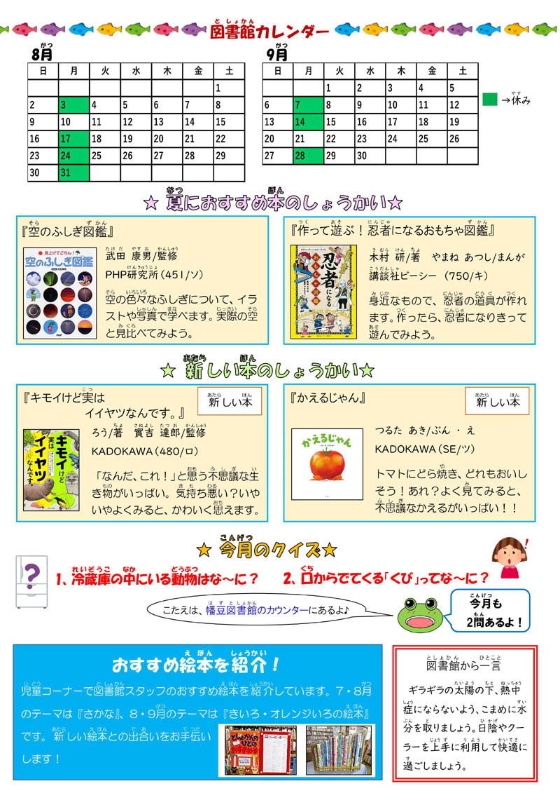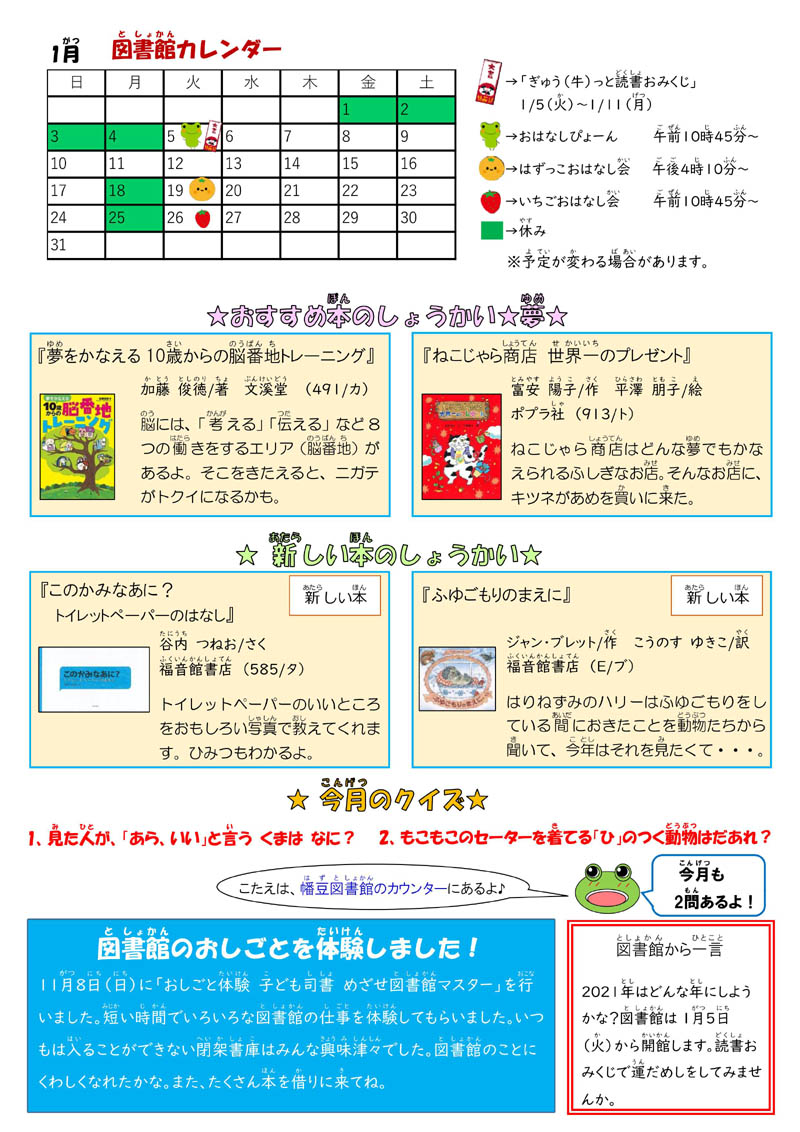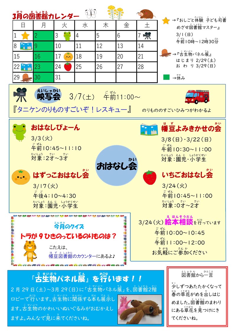 | 平成28年4月からスタートした「はずっと新聞」(幡豆図書館こども機関誌)をホームページに掲載します。行事などを紹介します。 なお、活動している様子の写真を顔が特定できないものにしたり、イラストに差し替えたりしてありますので、ご了承ください。 |
