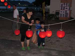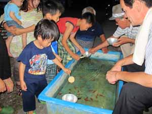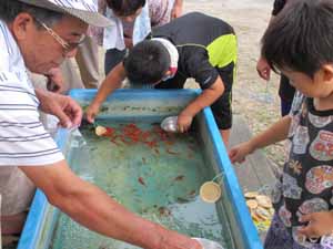 ![]() まだ明るくて、提灯の点灯はできないけど 金魚すくいのサービスはスタートです |
