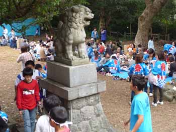 中柴、本郷両子供会の御輿は、8時半に各町内会長宅で修祓の儀が行われ、公民館で合流するまで町の中をワッショイ、わっしょい大きな声で練ります |