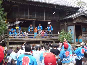 ![]() いよいよ餅投げです。写真は本郷子供会が投げます。餅、菓子が舞っています |