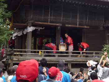 ![]() 今年祭礼の最後は、赤い法被を着た数えで61歳の厄年の氏子男が厄払いの餅を投げます |
