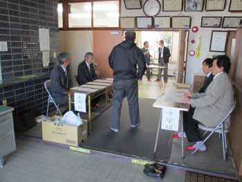 ![]() 受付の右側が中柴組、左側は本郷組で、出席者の名前のチェックを受け、議案書と参加記念品を受け取ります。 |