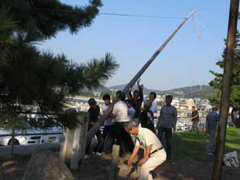 ![]() 12日の朝は、幟竿立てから始まります。幟は強風で午前中は下げていましたが、午後再び上げました |